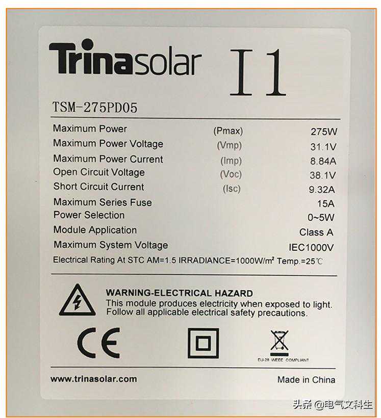 下面是天合光能的一块275W的光伏组件,参照组件铭牌我们可以知道: