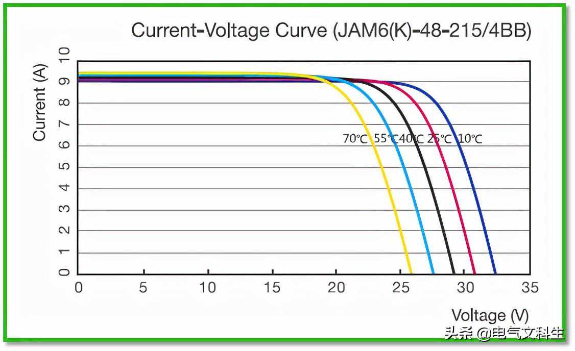 2、开路电压Voc(VoltsOpenCircuit)。太阳能光伏板开路时两端的电压,等同于我们日常所用的电池两端的电压。
