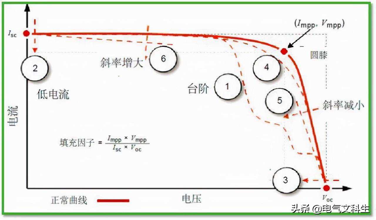 4、圆膝或膝盖变形,表现为开路电压和短路电流都正常,但是填充因子偏低,造成这种情况的原因可能是组件老化。