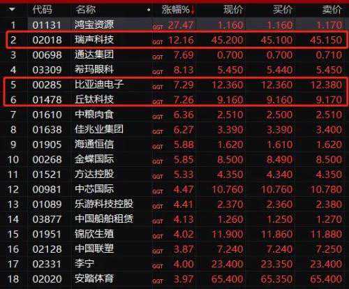 港股市场,华为产业链也大涨,瑞声科技涨逾10%,丘钛科技、比亚迪电子涨逾7%。