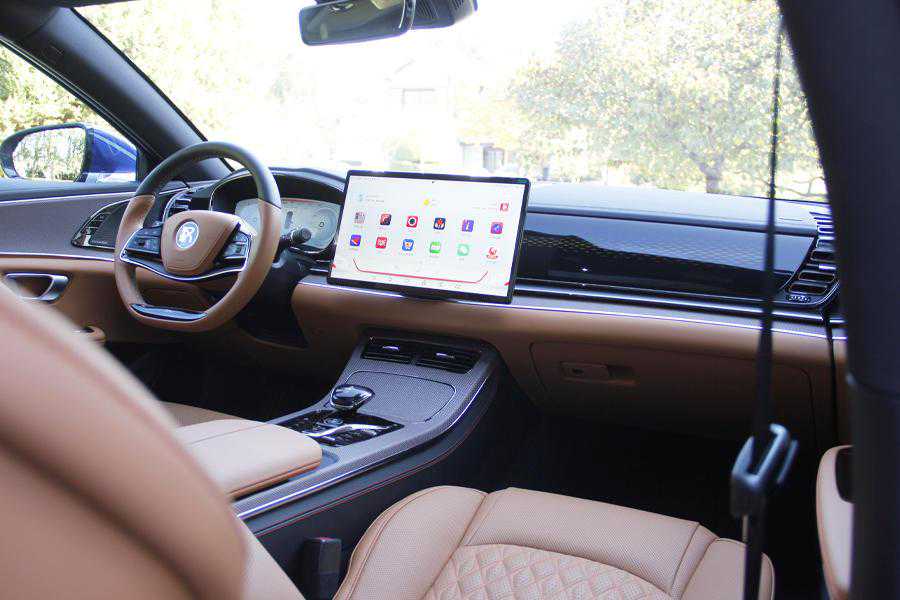 本次体验的车型是汉EV四驱高性能版旗舰型,并且外观使用了极光蓝配色,内饰使用了金鳞橙凝夜紫配色,实车可以说是汉EV最高版本车型。