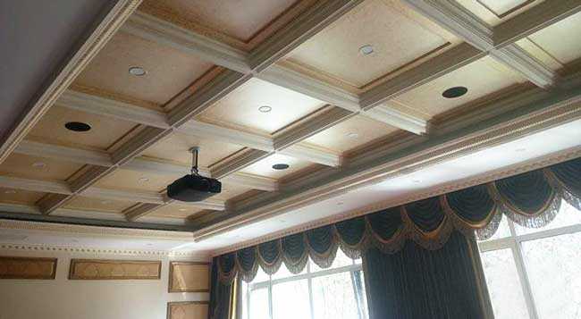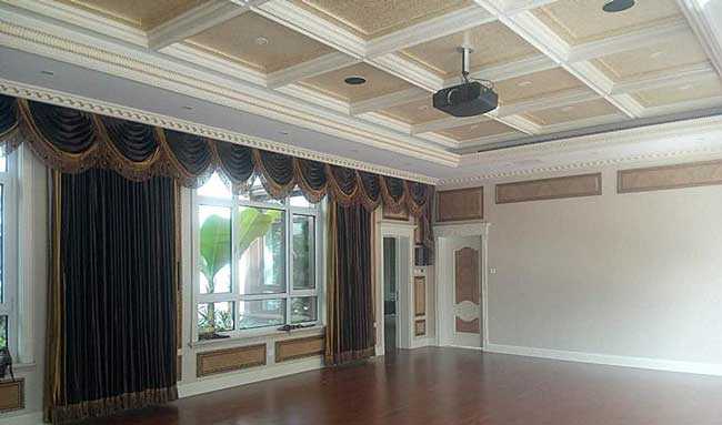 在原始的屋顶上进行了轻钢龙骨配合减震卡的结构,外封石膏板,形成了剪力空腔,在石膏板上又加固了木工板,方便实木造型的安装。完成顶高4.5米高所以此主音箱采用了近2米高的旗舰。同时皇帝位上方的扩散板对环绕声的弥散起到了很好的作用。一个专业影院所需的具有吸音效果的屋顶便出现在这里。因有日常照明需求,有窗户一侧采用不透光的厚重窗帘,拉上后既有遮光的作用,更有吸音的效果,一石二鸟。