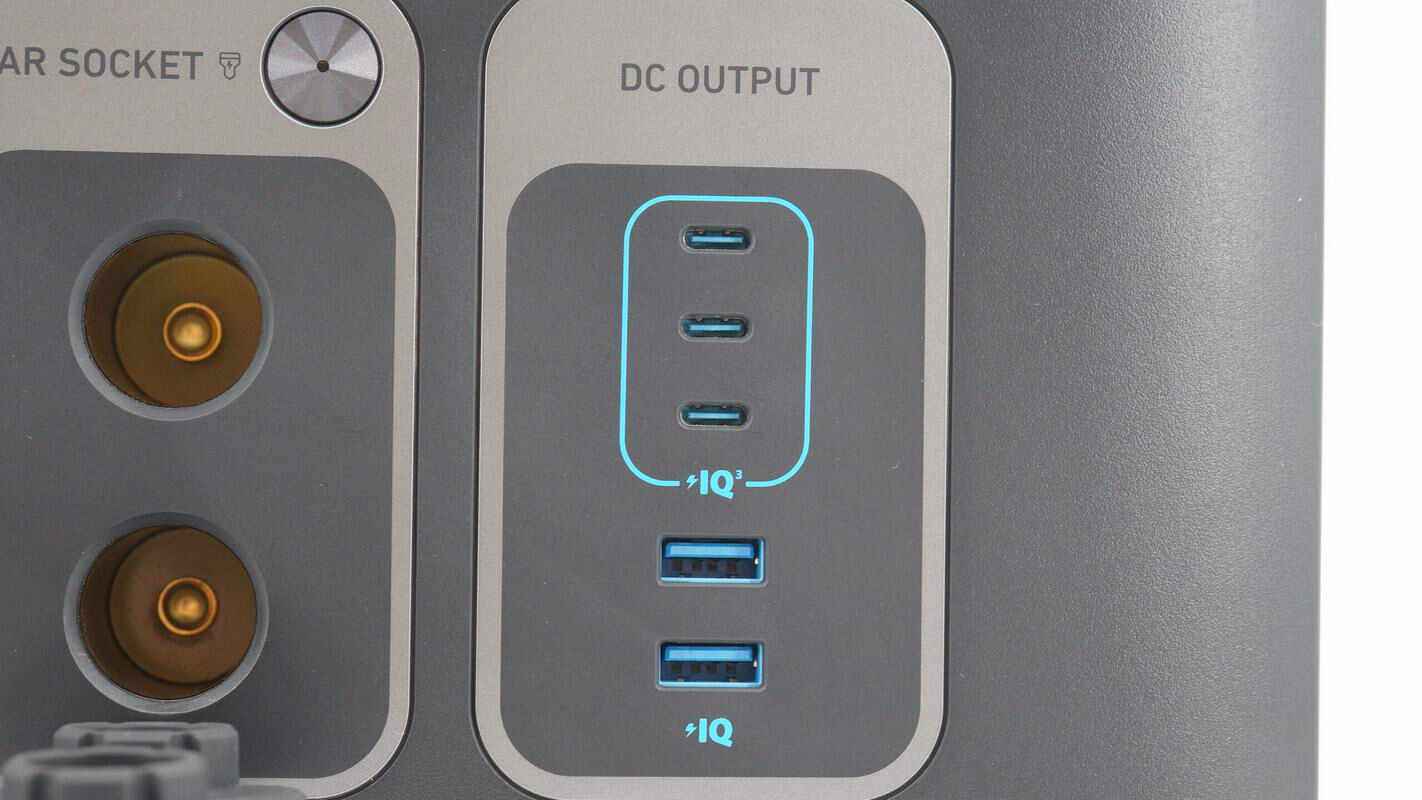 右侧区域配有2A3C接口,其中USB-A接口支持12W输出,USB-C接口支持100W快充。