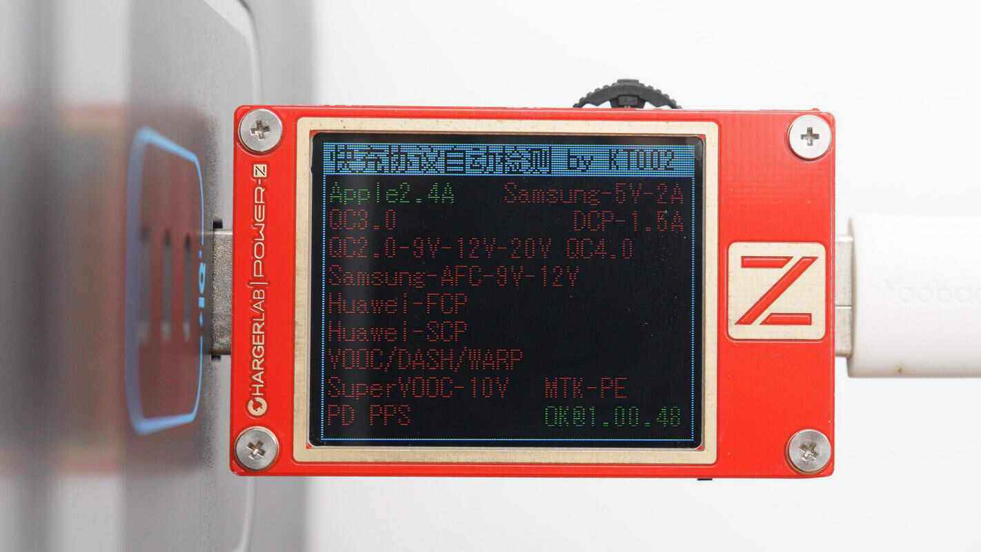 使用ChargerLABPOWER-ZKM003C测得USB-C接口支持、、PPS、QC5快充协议。