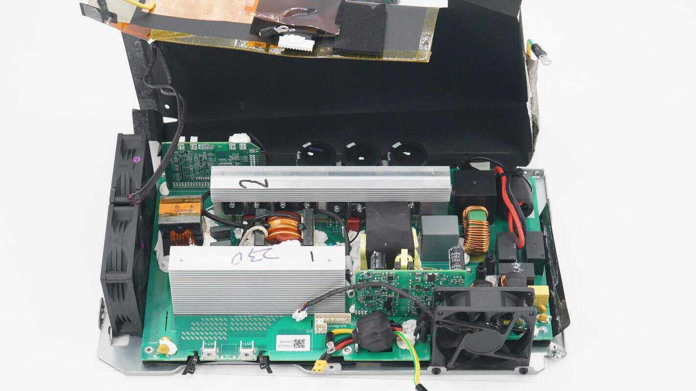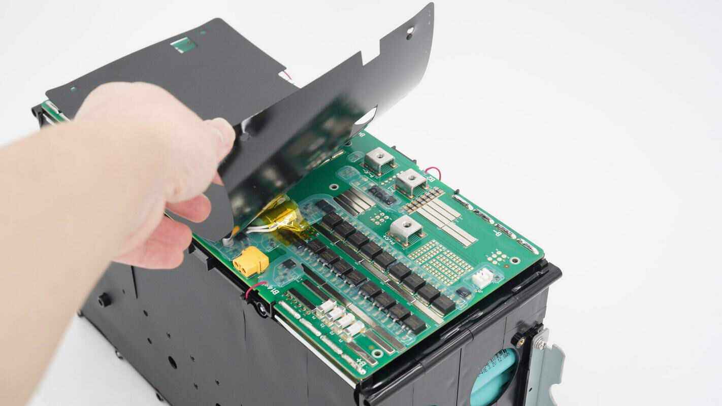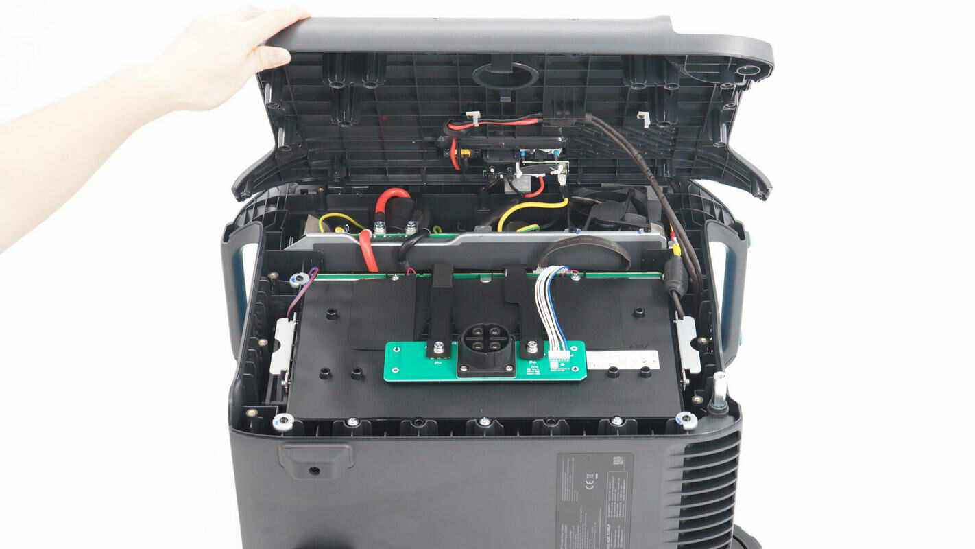 拆开侧面盖板,面板为太阳能充电输入接口,过载保护器和交流输入插座,底部为连接电池模块的连接器。