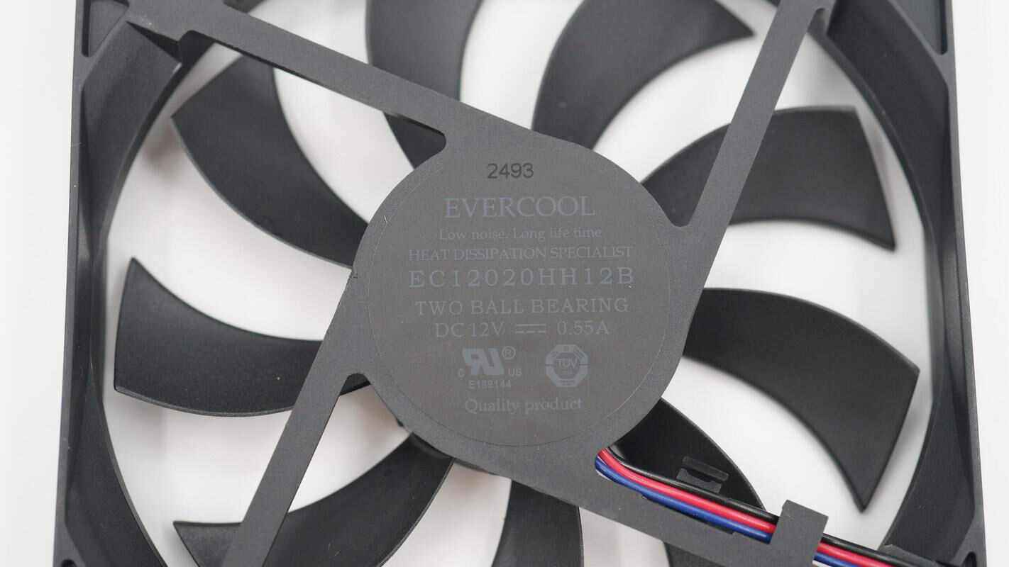 风扇来自EVERCOOL捷冷,为12020尺寸,风扇为双滚珠轴承,额定电压12V,电流0.55A。