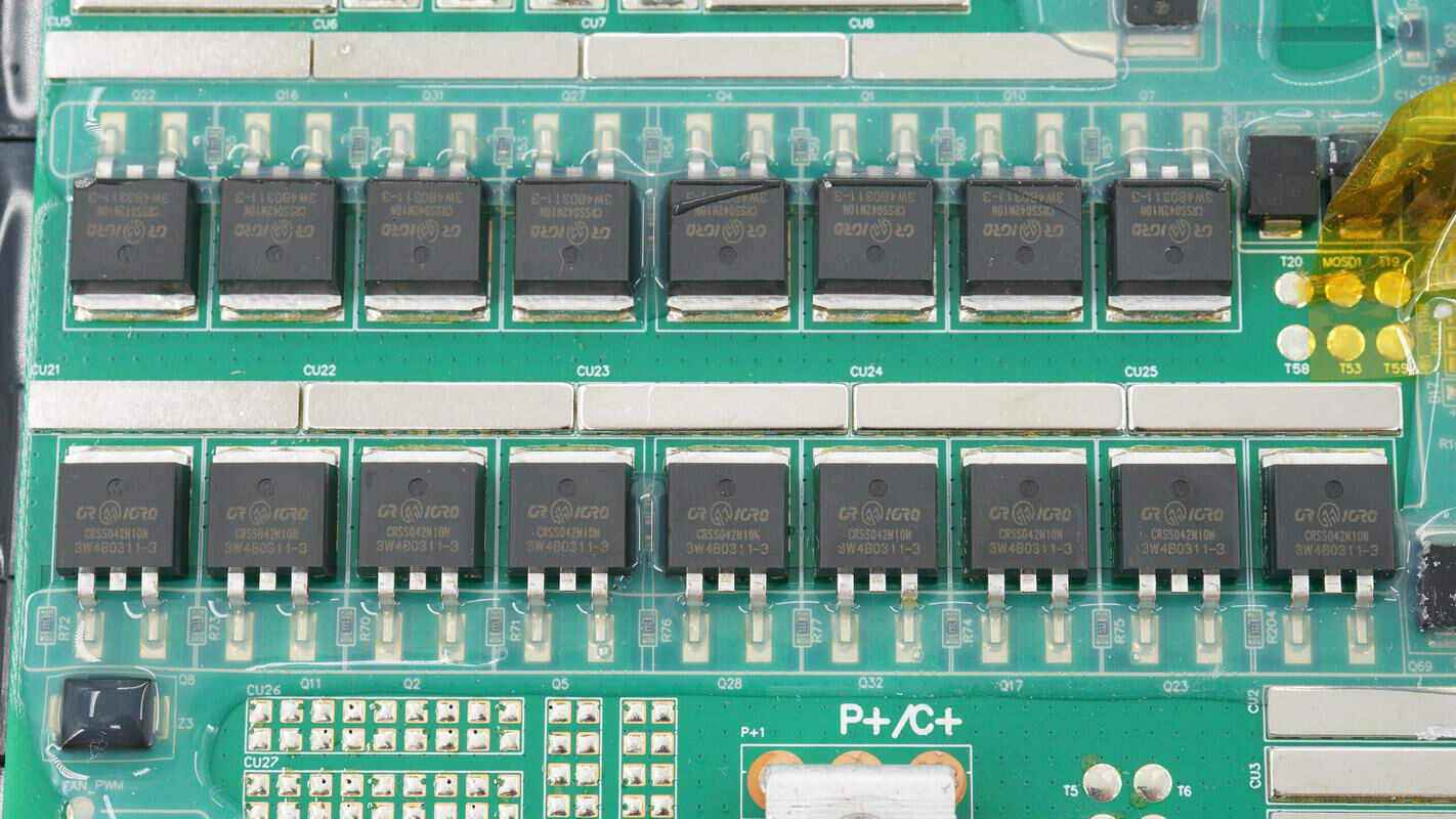 电池保护管来自华润微,型号为CRSS042N10N,是一颗耐压100V,导阻3.6mΩ的NMOS,采用TO263封装。焊点打胶保护,并在MOS管中间布置热敏电阻检测温升。