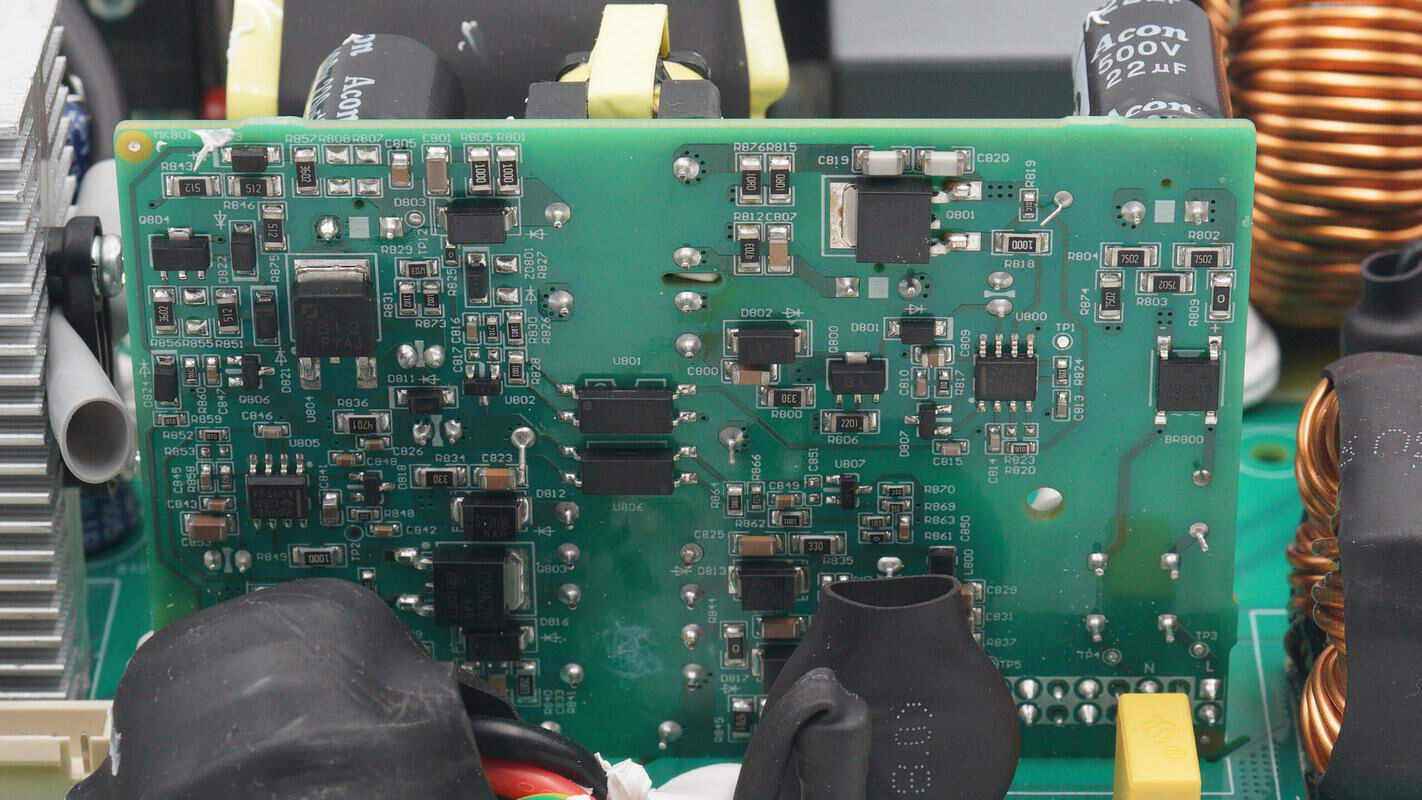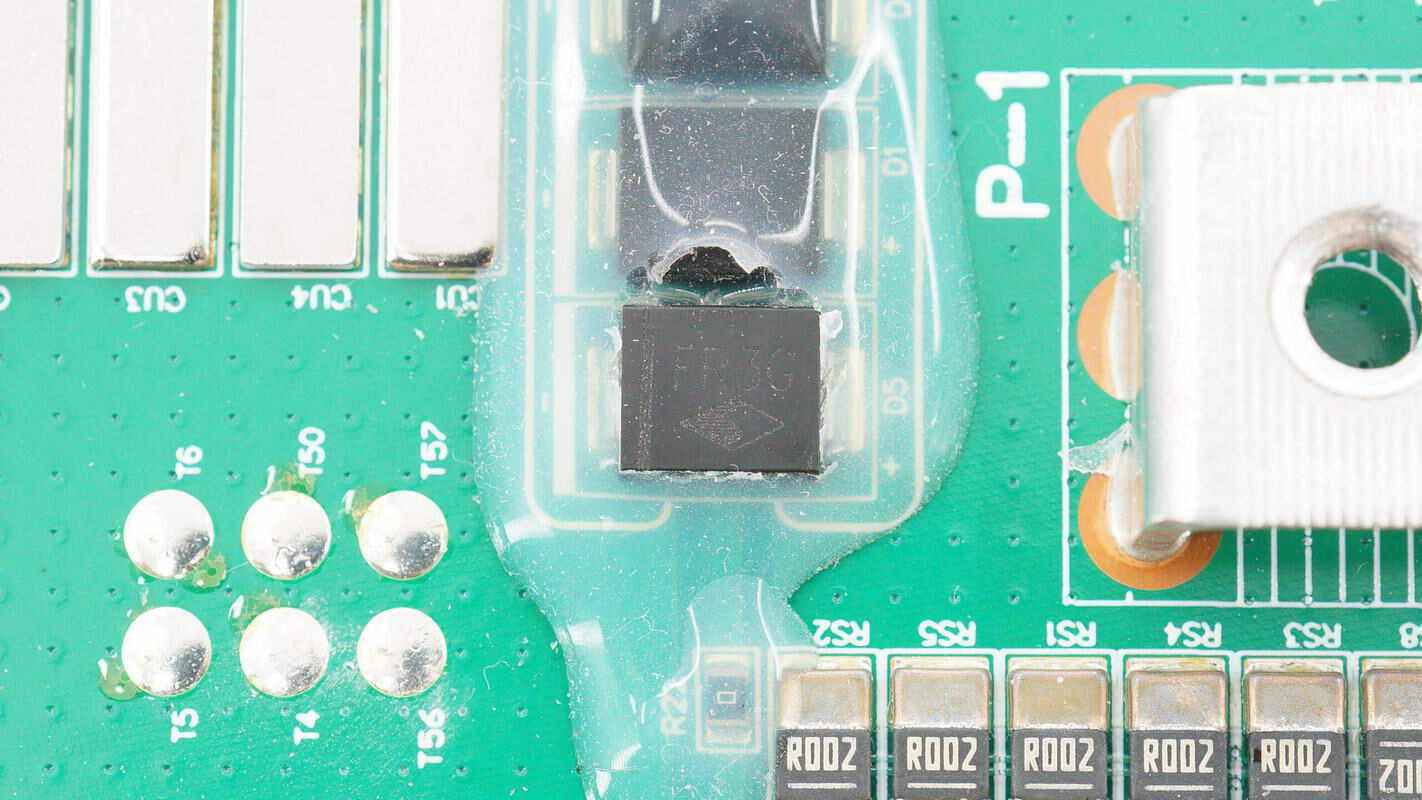 四颗开关管均来自英飞凌,型号IPW60R070F7,为CoolMOSCFD7系列,是一颗耐压650V,导阻70mΩ的NMOS,用于输出波形调制及输入主动整流。