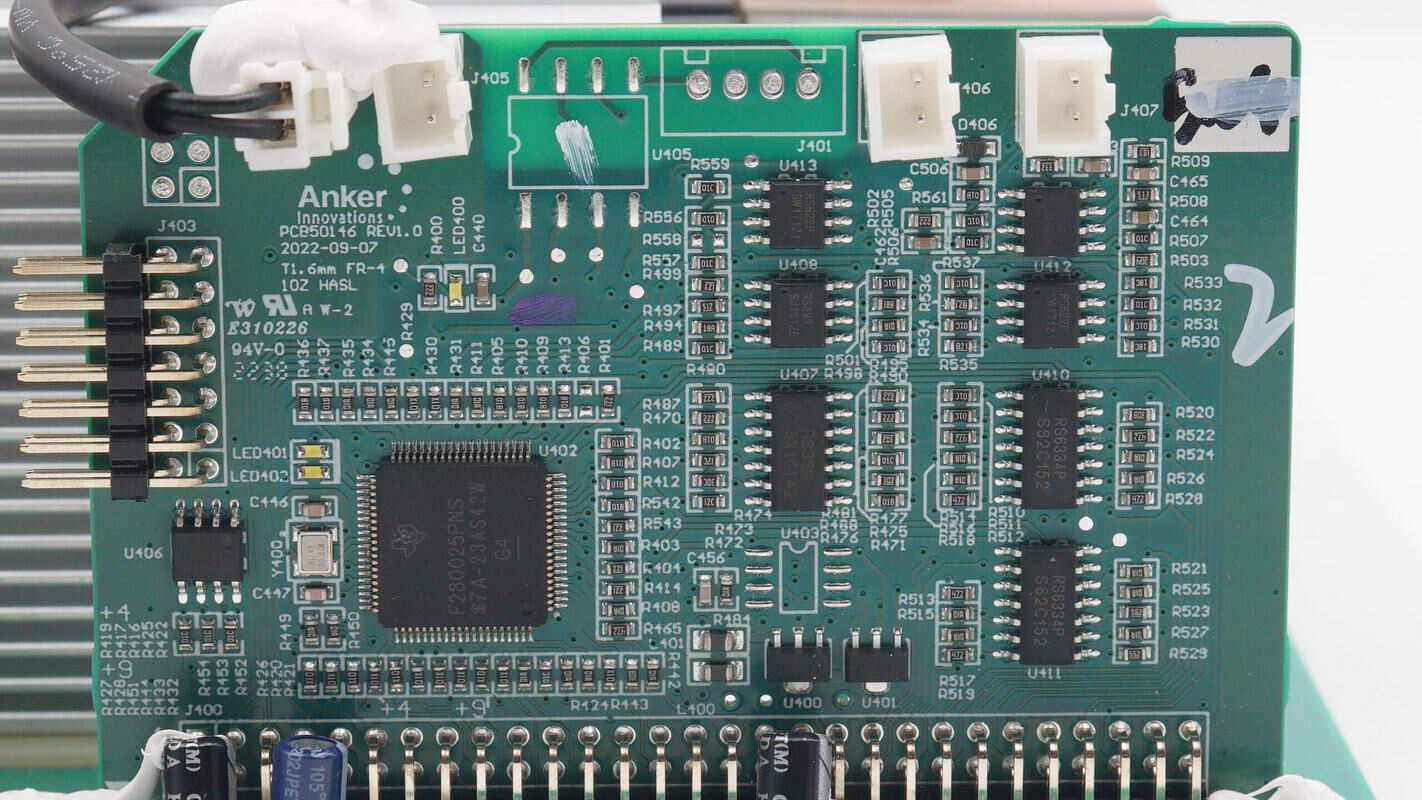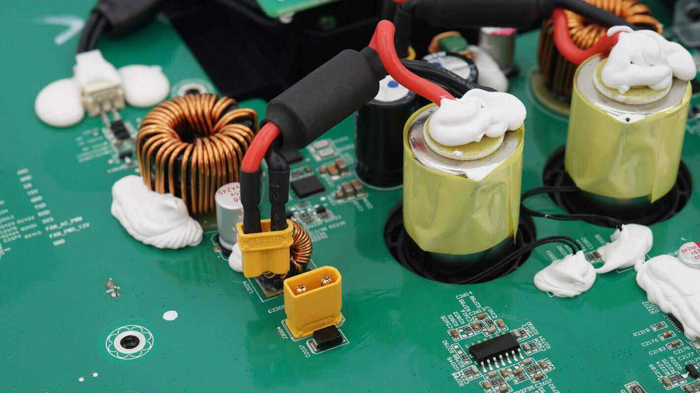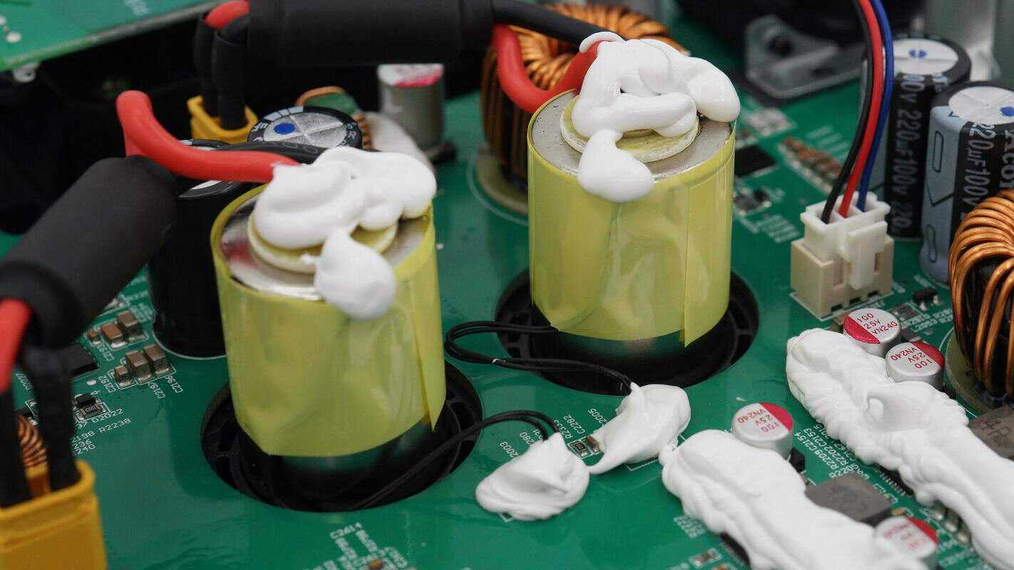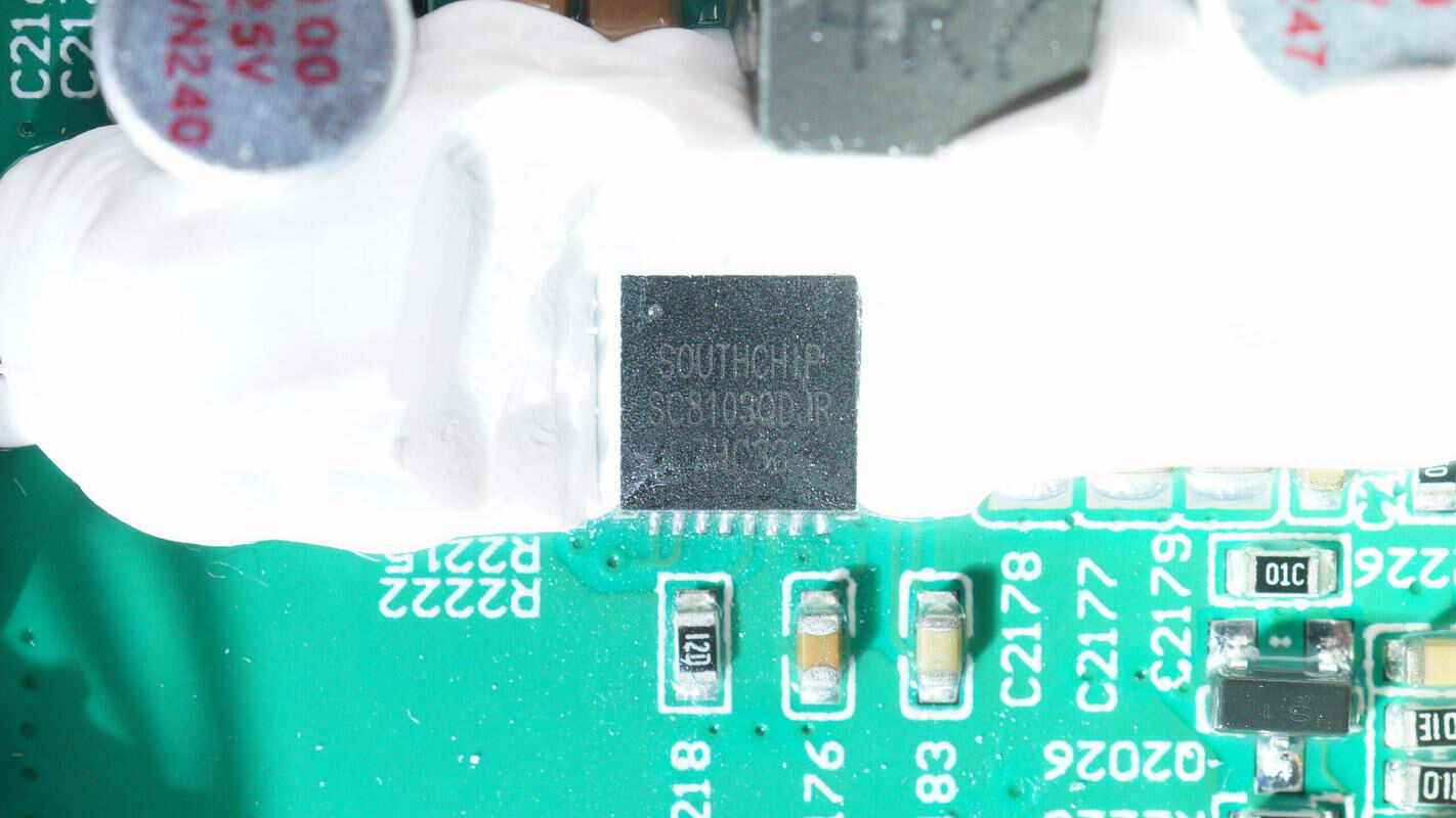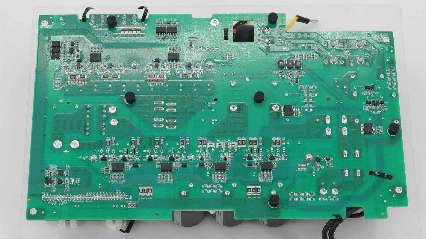 直流快充模块采用德州仪器C2000系列MCU芯片进行MPPT控制,并采用南芯科技SC8103进行降压输出,使用英飞凌CYPD3135用于USB-C协议,USB-A接口采用赛微CW3002G进行自动识别。元件均打胶固定。电源内置7个风扇,分别用于电池组,双向逆变模块和直流快充模块的散热。内部大量使用国产功率器件和运放芯片,高压电解电容来自新中元,固态电容来自柏瑞凯,国产化程度相当高。