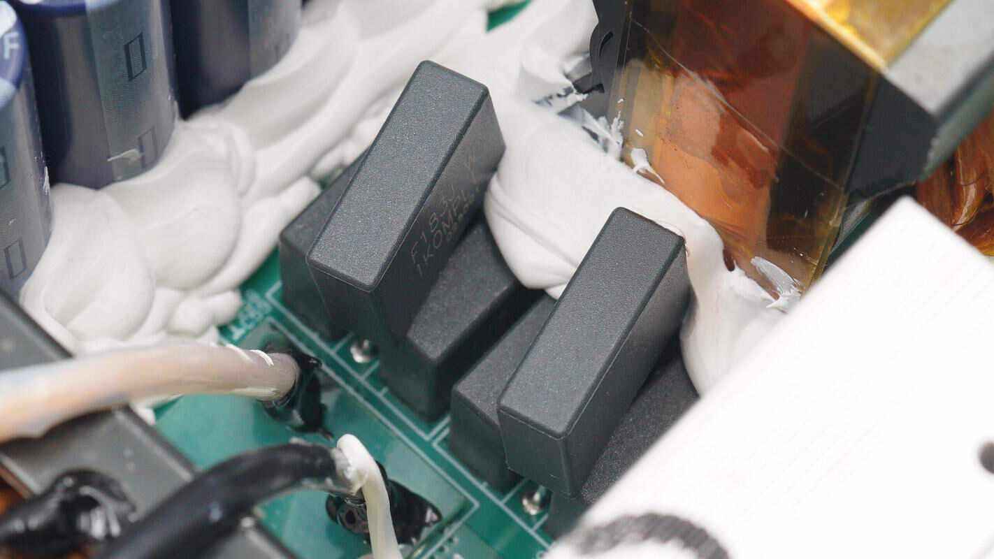 高压滤波电容来自新中元,规格为500V330μF,采用三颗并联。