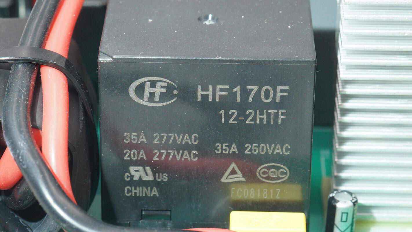 用于输出控制的继电器来自宏发,型号HF170F,为两组触点设计,继电器内置两组主触点和一组辅助触点,实现安全监测功能。线圈电压为12V,内置两组常开触点,辅助触点为常开触点。