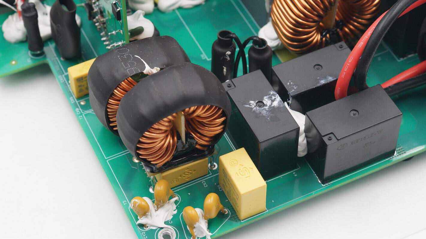 双向逆变模块采用金属底座,麦拉片贴有导电布屏蔽。
