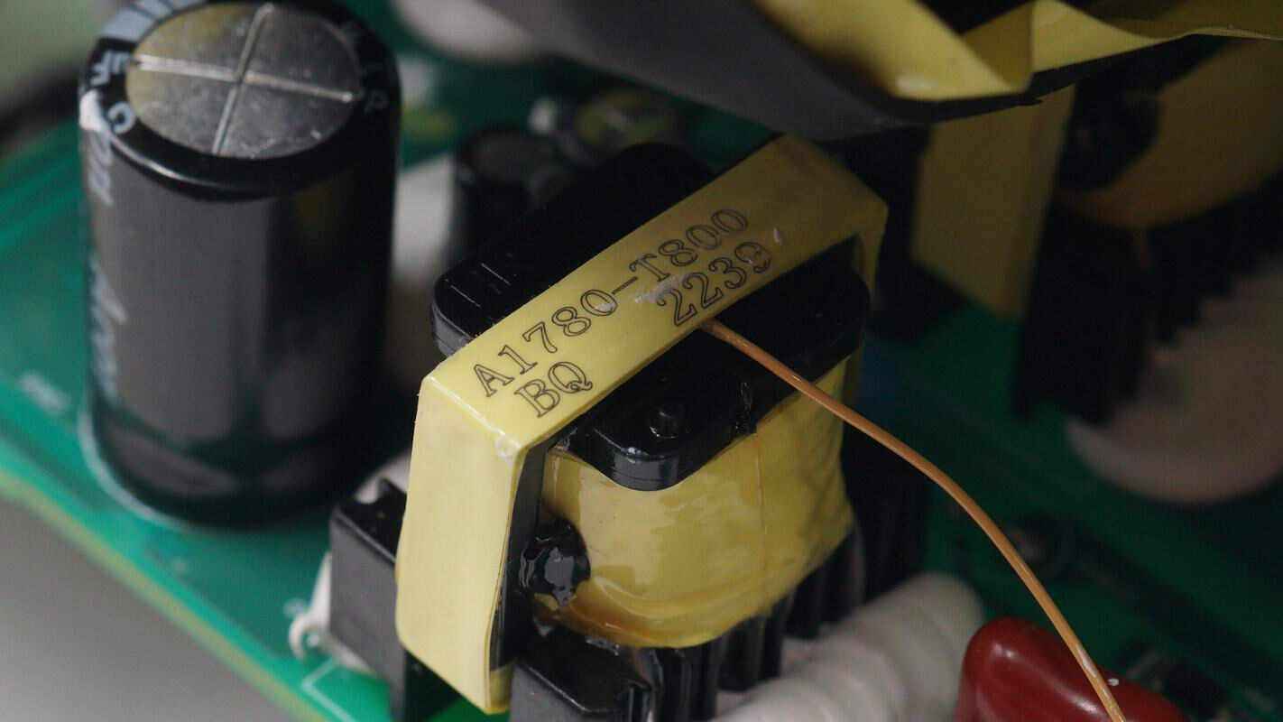 辅助电源小板垂直焊接在电源板上,通过排针连接,并打胶固定。小板正面焊接电解电容和变压器等元件。