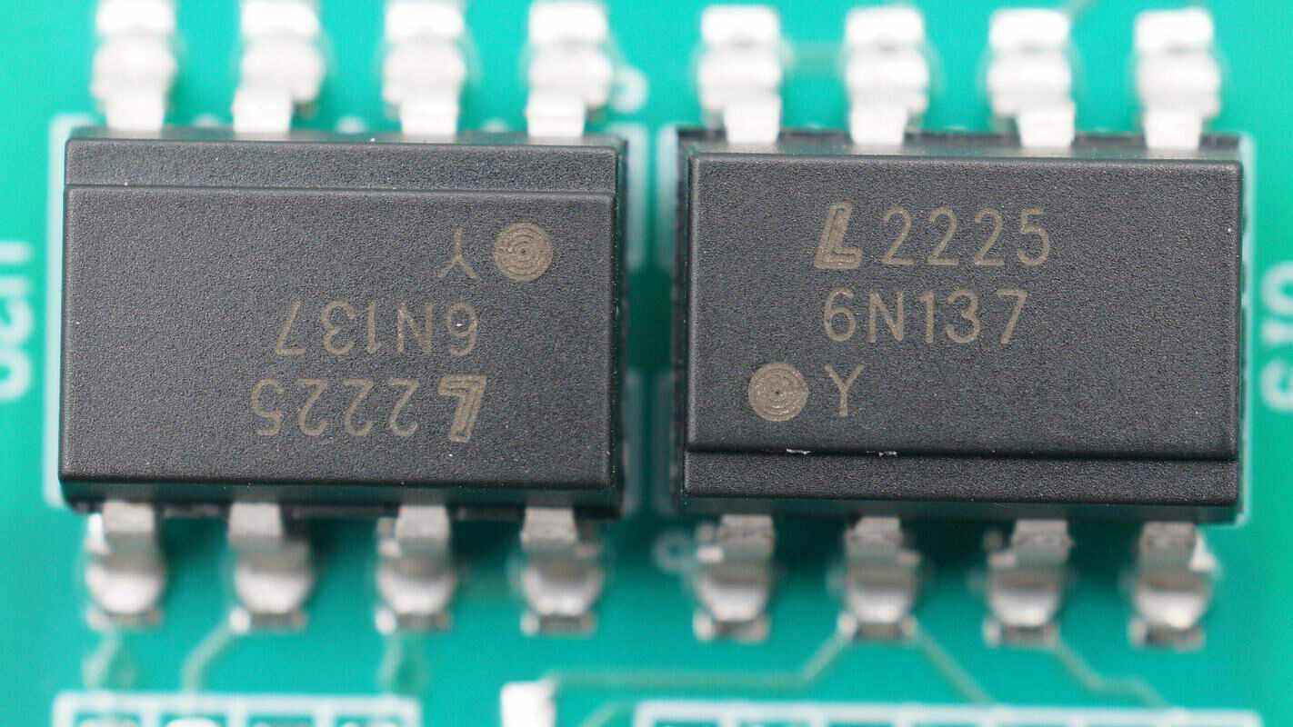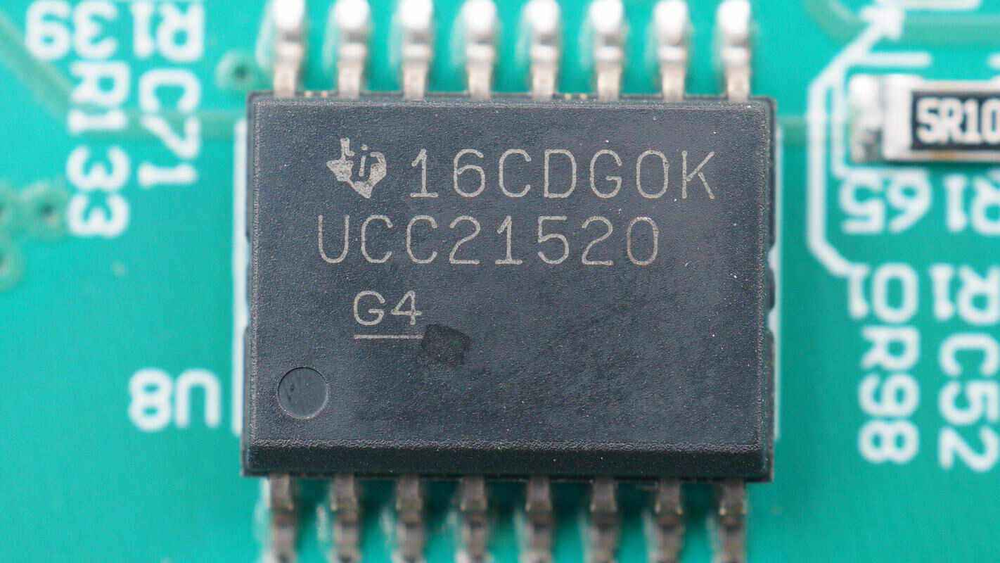 在双向逆变电路板背面焊接六颗隔离驱动器芯片,来自TI德州仪器,型号UCC21520,是一颗双路隔离驱动器,支持双路低侧,高侧以及半桥应用,具备4A拉电流,6A灌电流输出,采用电容隔离,具备5700Vrms的隔离能力。