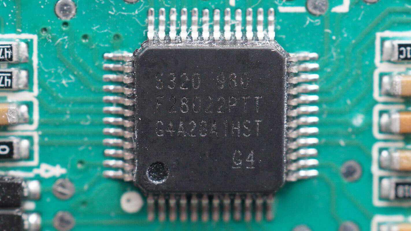 主控芯片来自TI德州仪器,为C2000系列实时微控制器,型号TMS320F280025PNS,芯片内置32位DSP内核,主频100MHz,内部集成FPU和TMU,内置128KB闪存。可用于工业电机驱动,电机控制,光伏逆变器,数字电源,电动车辆与运输,感应和信号调理用途。