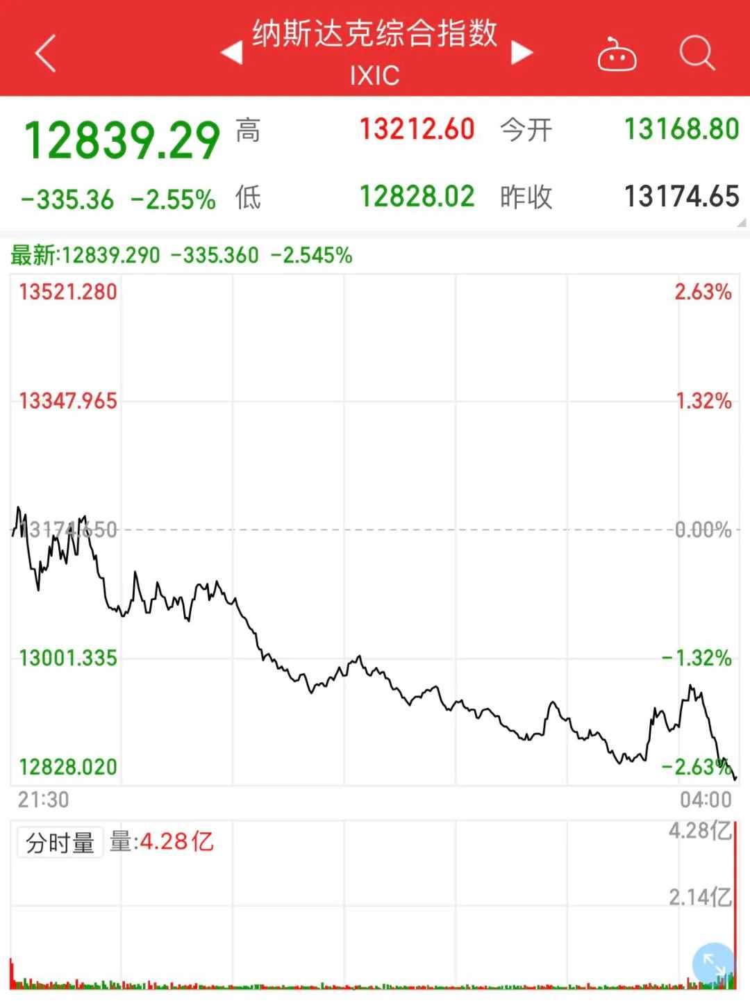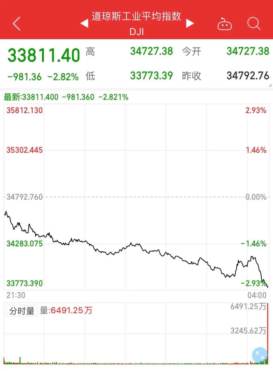 截至收盘,道琼斯指数跌2.82%,报33811.40点;标普500指数跌2.77%,报4271.78点;纳斯达克指数跌2.55%,报12839.29点。