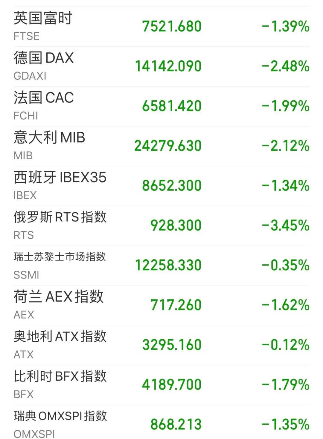 欧洲三大股指当天也全线下跌。英国伦敦股市《》100种股票平均价格指数报收于7521.68点,比前一交易日下跌106.27点,跌幅为1.39%。法国巴黎股市CAC40指数报收于6581.42点,较前一交易日下跌133.68点,跌幅为1.99%。德国法兰克福股市DAX指数报收于14142.09点,较前一交易日下跌360.32点,跌幅为2.48%。