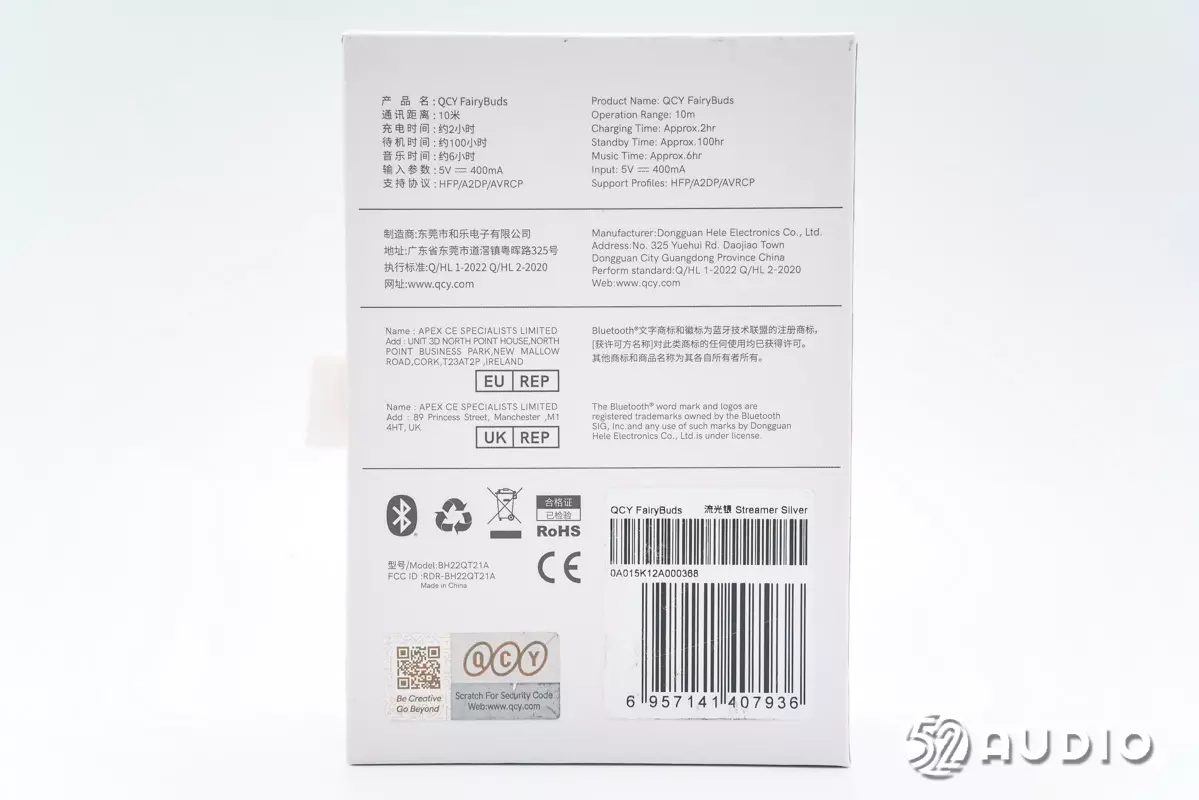 包装盒背面介绍了产品的规格参数信息,产品名:QCYFairyBuds,通讯距离:10米,充电时间:约2小时,待机时间:约100小时,音乐时间:约6小时,输入参数:5V-400mA,支持协议:HFP/A2DP/AVRCP,制造商:东莞市和乐电子有限公司。