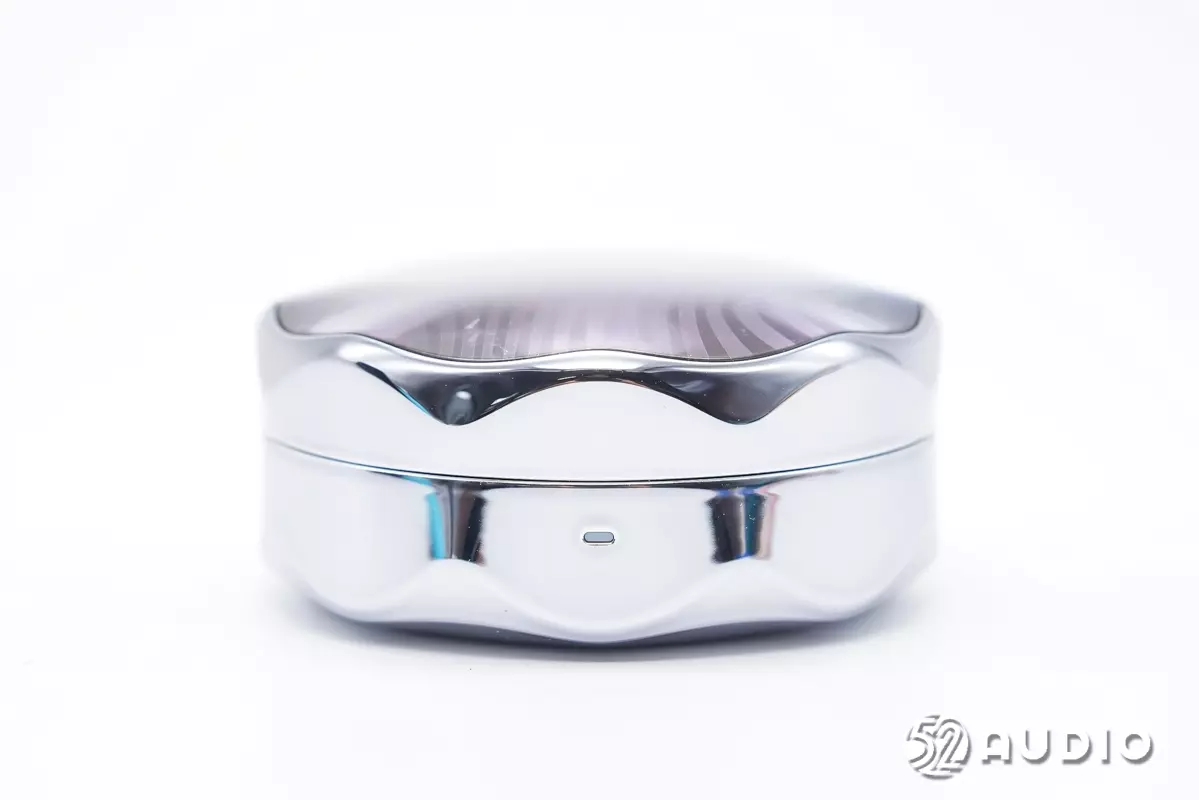 充电盒底部外观一览,机身采用了NCVM真空镀膜工艺,触感顺滑细腻。底座设计有三颗凸点,防止机身磨损。