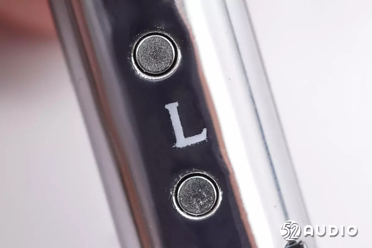 耳机柄内侧为耳机充电的金属触点特写,中间设计有L/左标识。