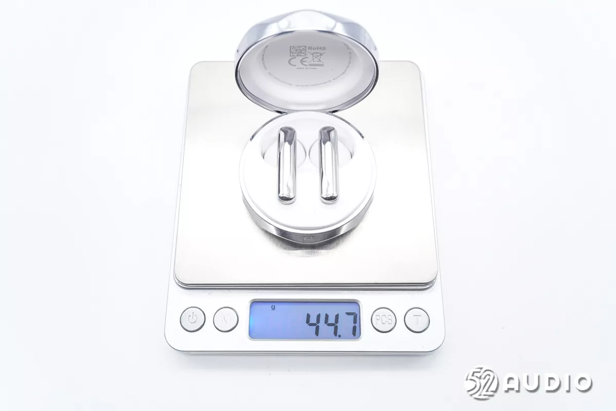 经我爱音频网实测,QCYFairyBuds真无线耳机整机重量约为44.7g。
