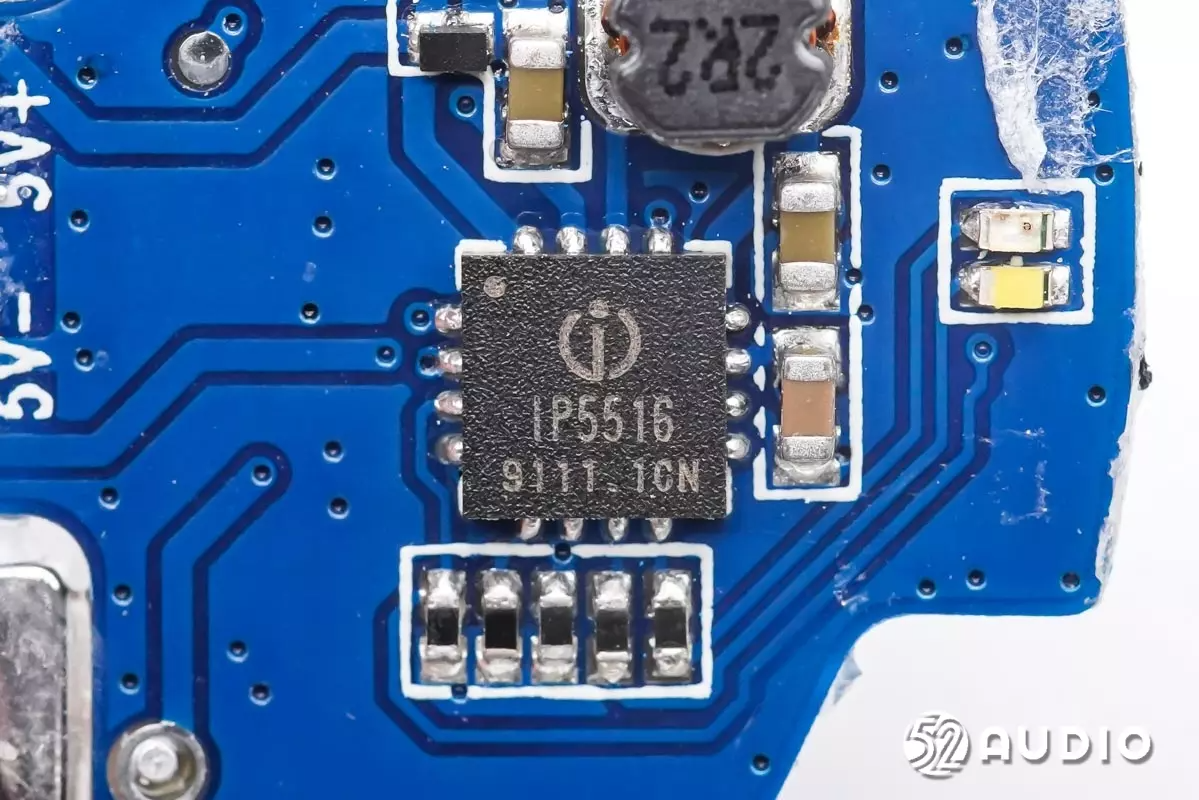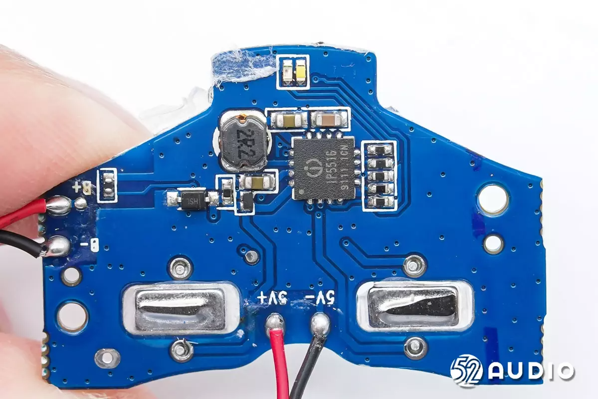 内部结构配置方面,充电盒内置小锂新能源290mAh电池,采用Type-C接口输入电源,由英集芯IP5516充电盒管理SoC负责充放电管理,并集成MCU、电池电量指示、5V单向通讯等功能;由创芯微CM1125系列锂电保护IC负责电池的充放电保护,集成MOSFET,使用更便捷。