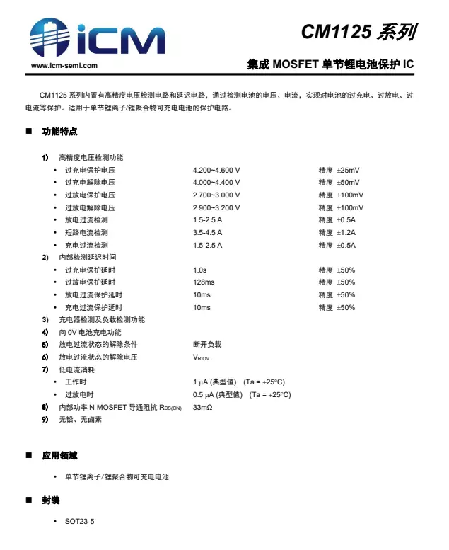 iCM创芯微CM1125系列集成MOSFET单节锂电池保护IC,内置有高精度电压检测电路和延迟电路,通过检测电池的电压、电流,实现对电池的过充电、过放电、过电流等保护。适用于单节锂离子/锂聚合物可充电电池的保护电路。