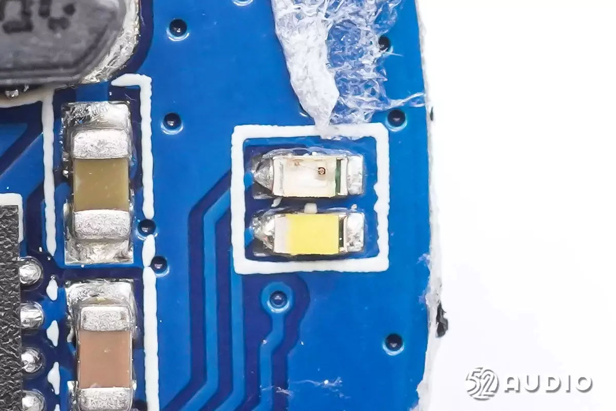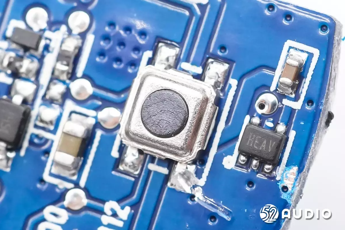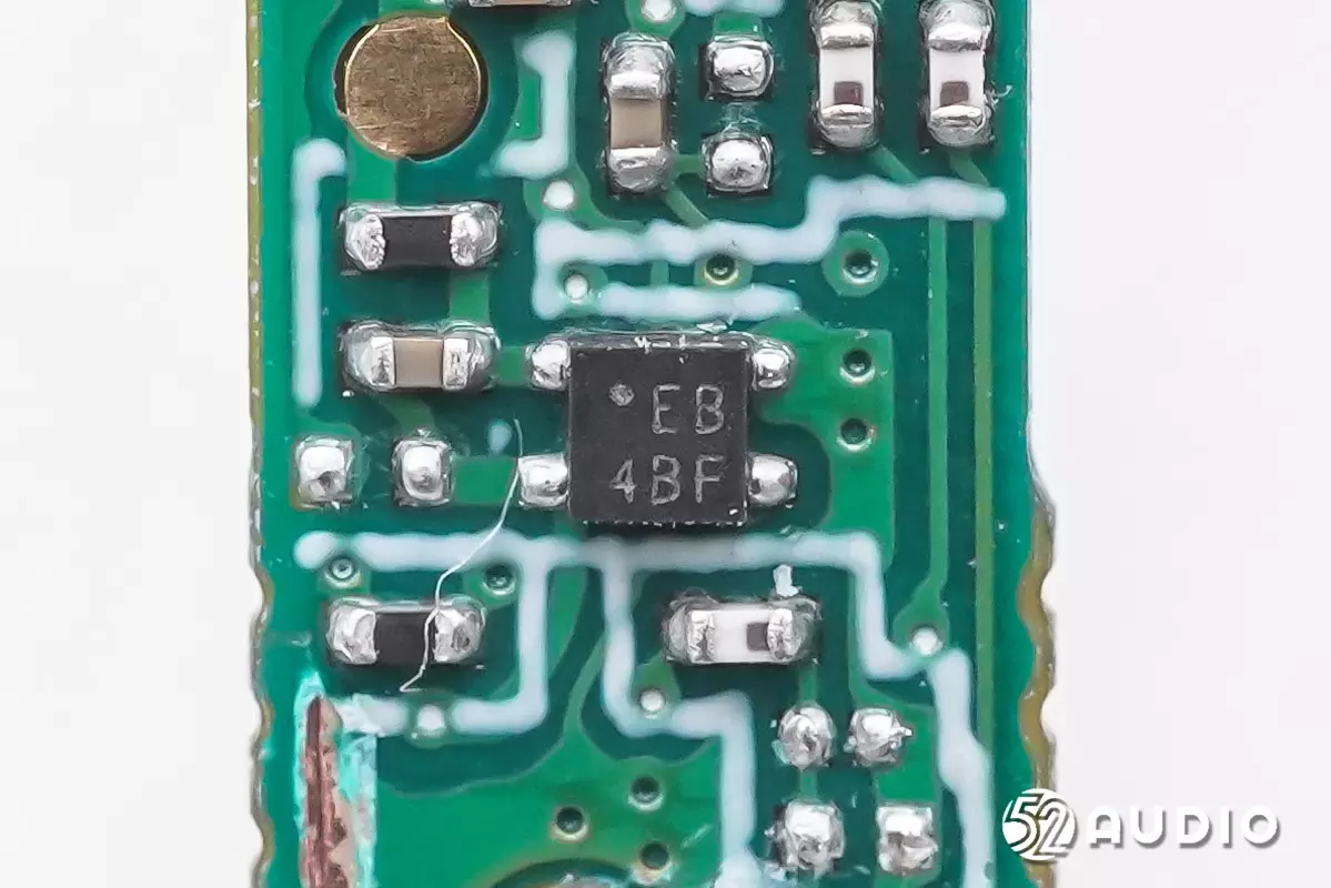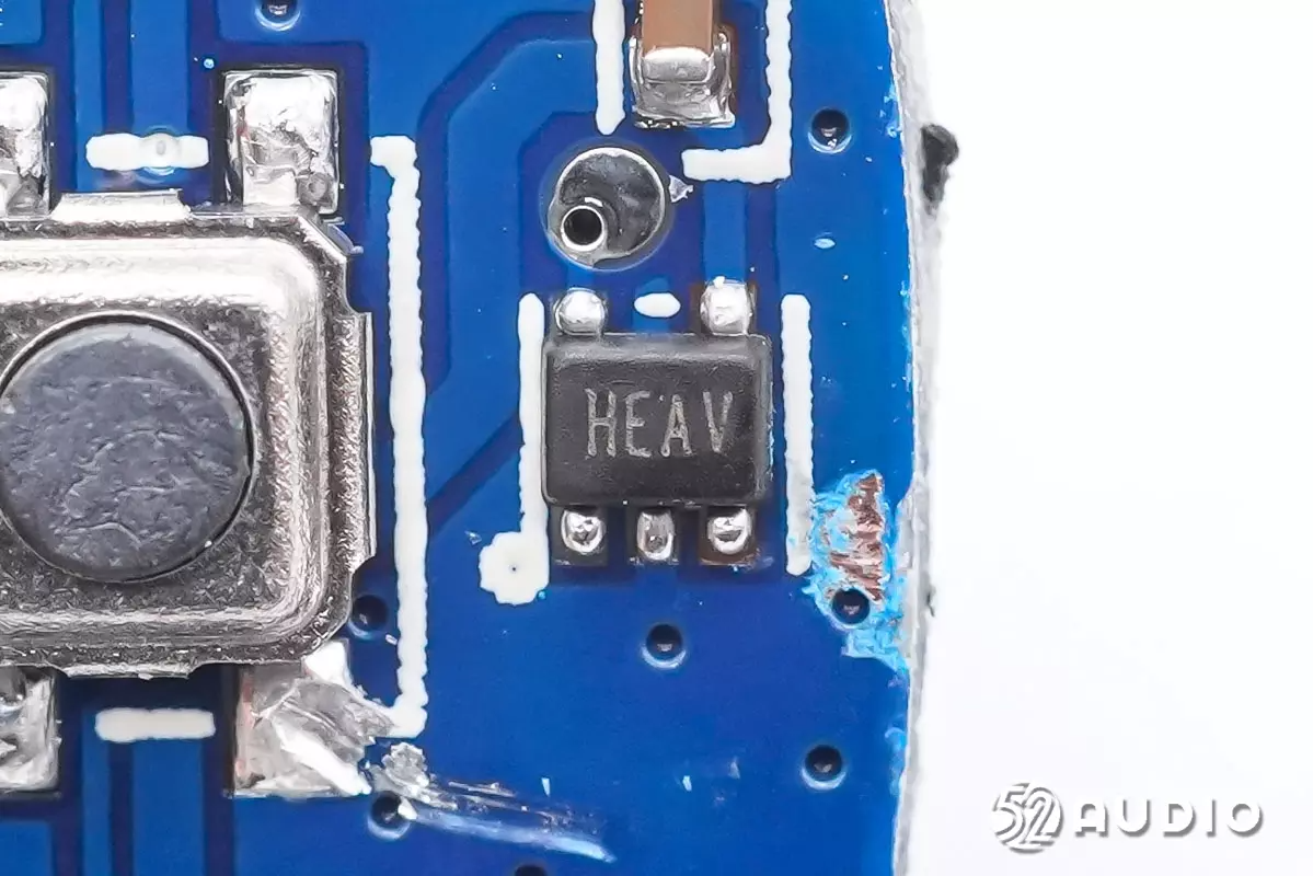 丝印HEAV的霍尔元件特写,通过感知充电盒盖打开/闭合时的磁场变化(霍尔效应),通知充电盒MCU和耳机与已配对设备连接/断开。