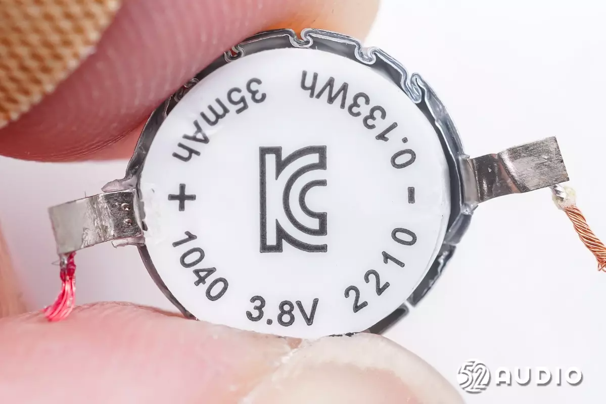 耳机内部采用了软包扣式电池,标签上信息有型号:1040,电压:3.8V,容量:35mAh/0.133Wh。