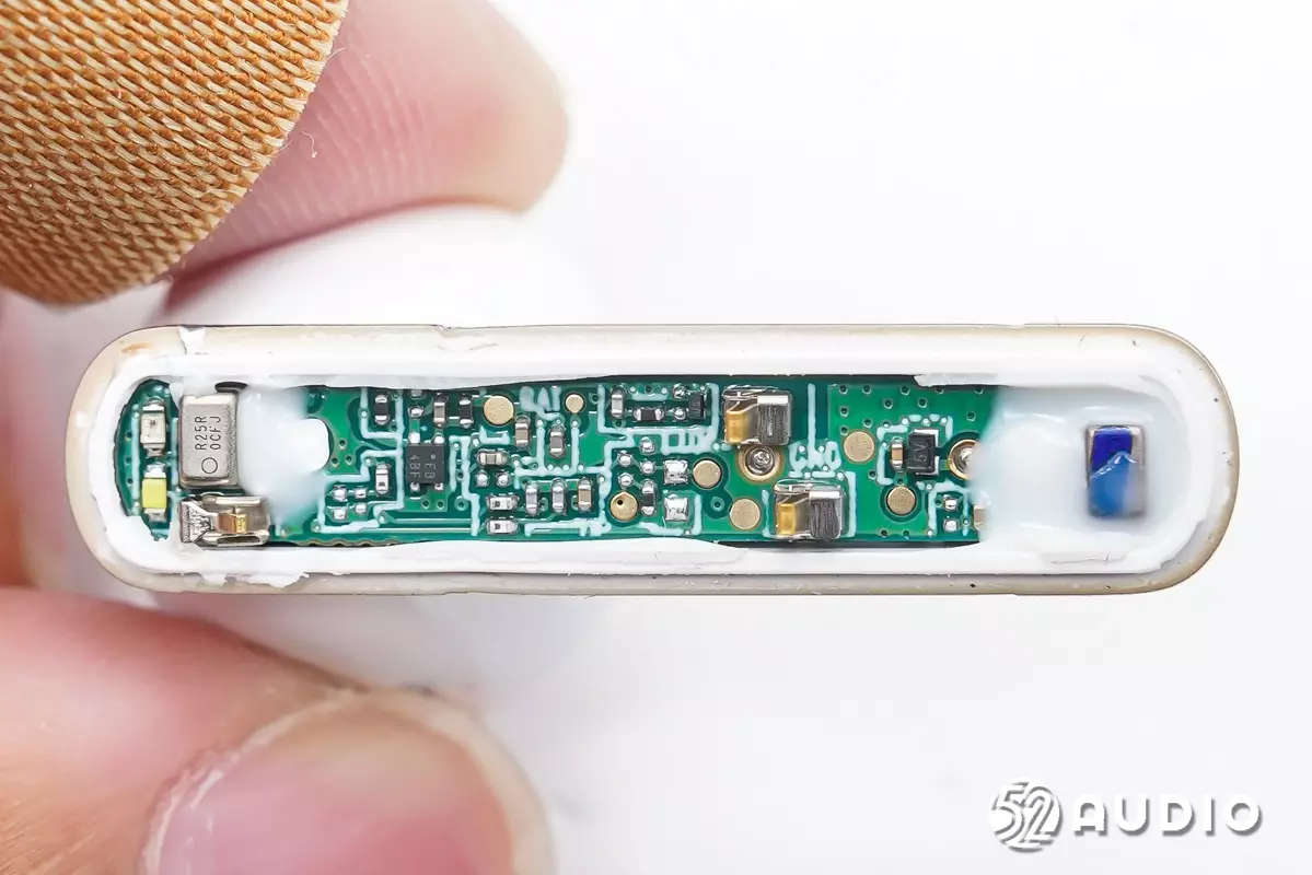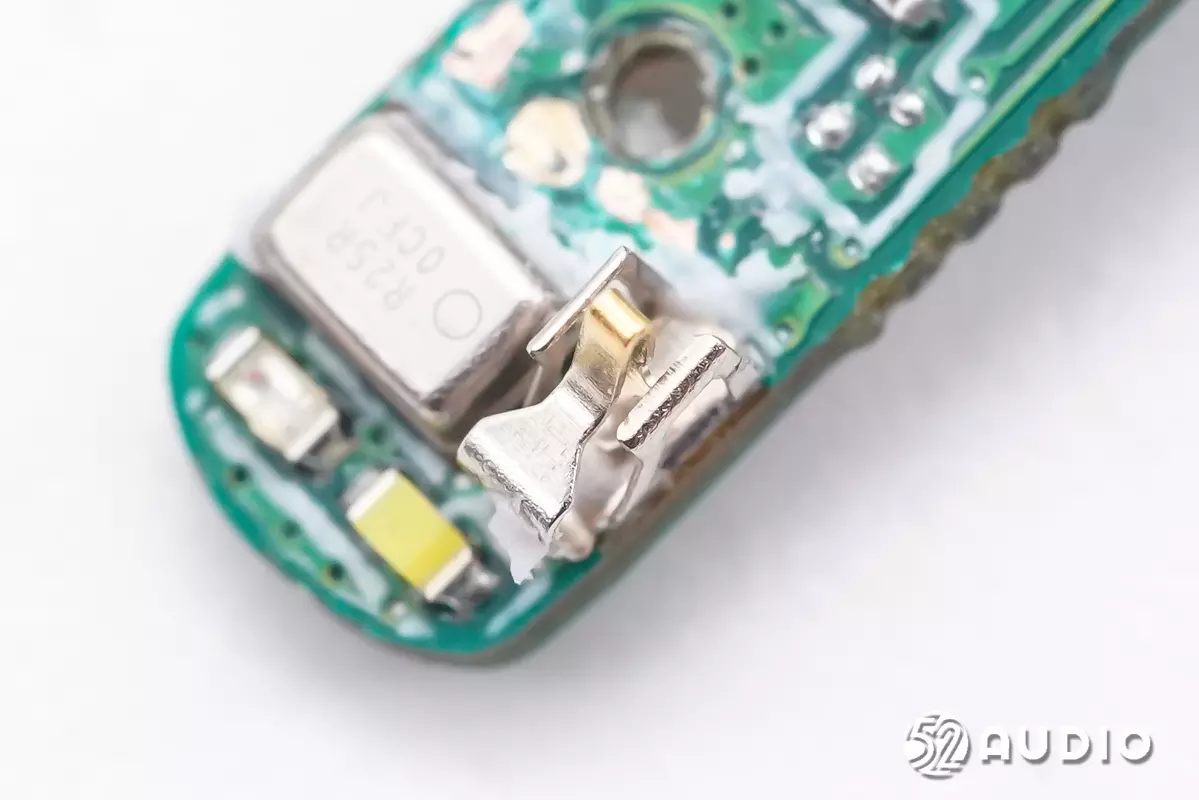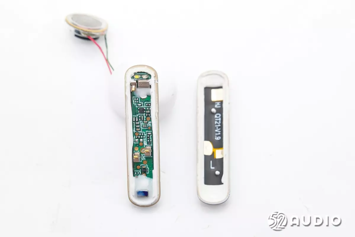 后腔内部结构一览,固定电池单元,与扬声器分别通过导线连接到耳机柄内部主板。