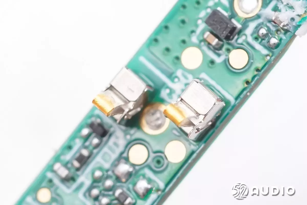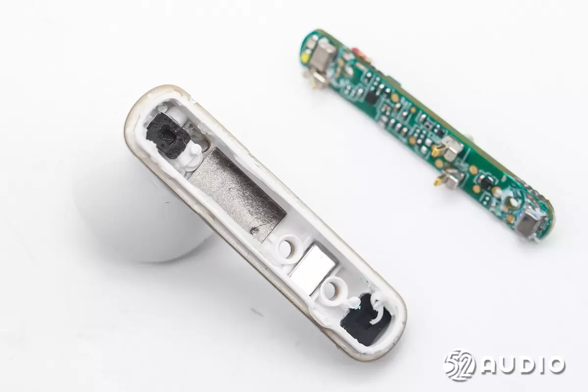 取出主板,腔体内部结构一览,两个触点中间设置有磁铁,用于与充电盒固定。