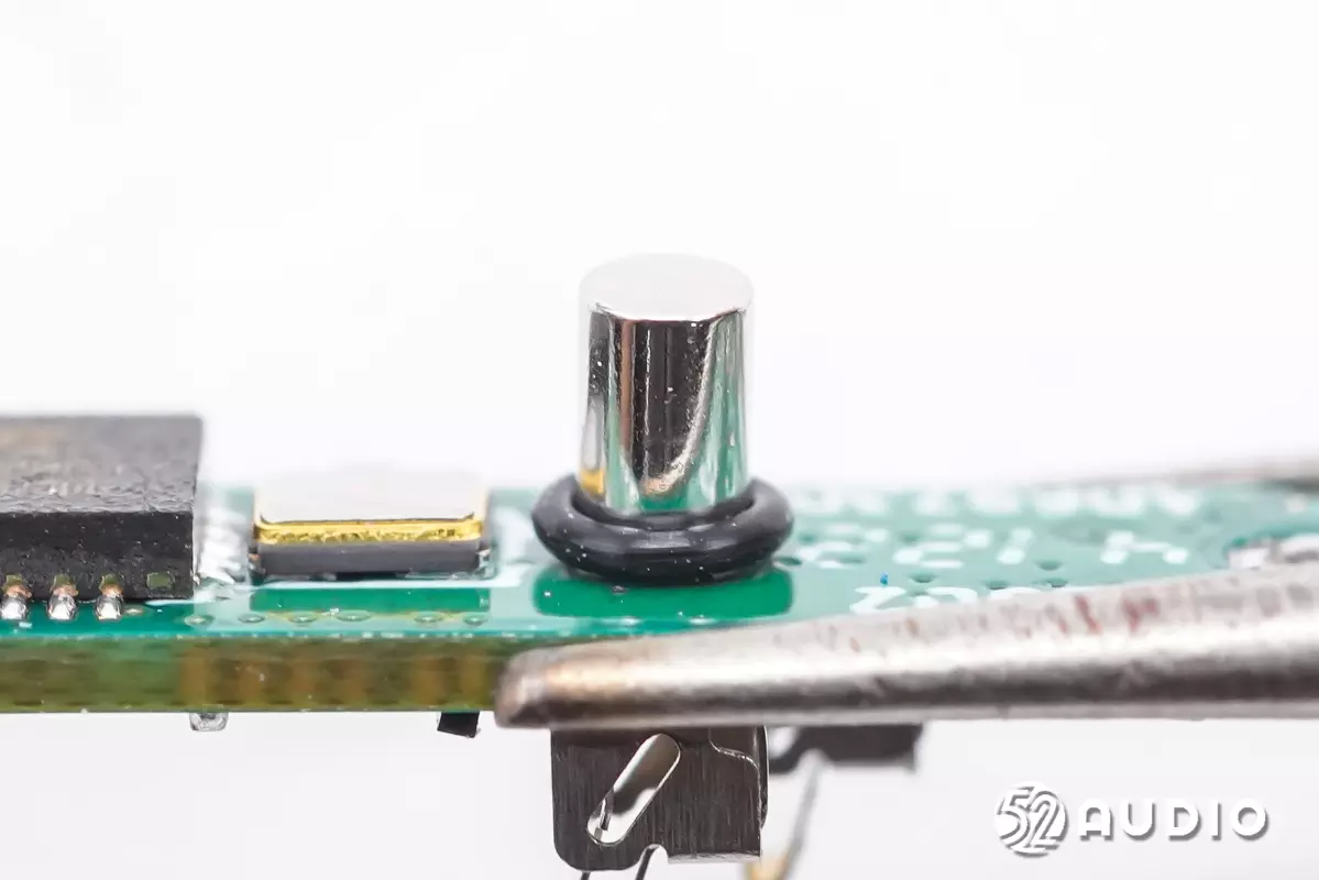 主板上为耳机充电的PogoPin连接器特写,中间固定磁铁,用于吸附耳机。