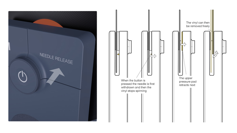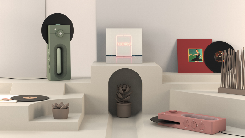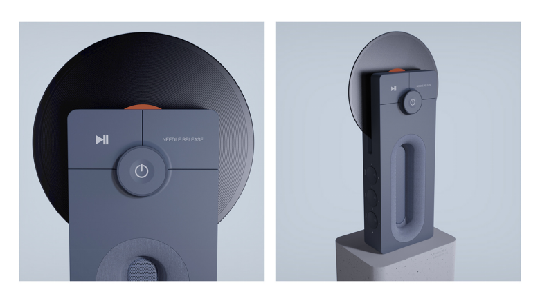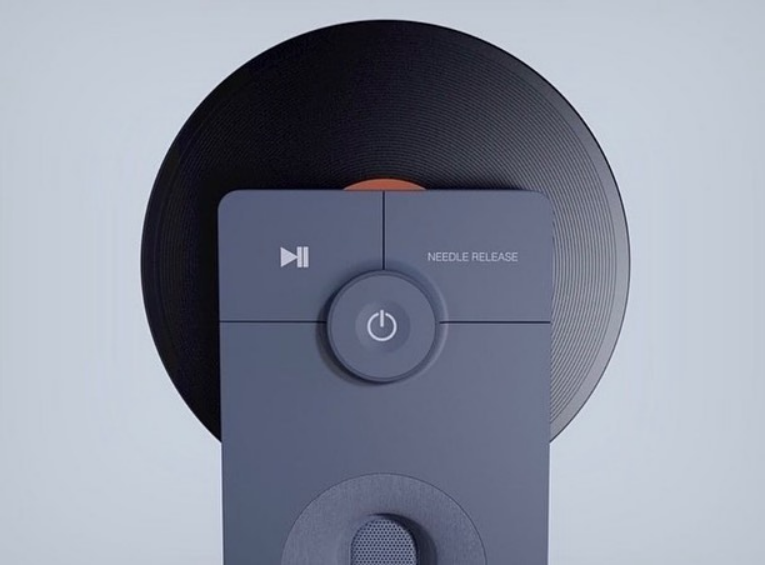 一款可以播放唱片的音乐播放器。随着现代普通人可用的房间面积越来越小,桌面上的内容越来越杂,设计师希望设计一款现代风格唱片播放器对空间的需求更小,以及更流畅,简洁的设计感。