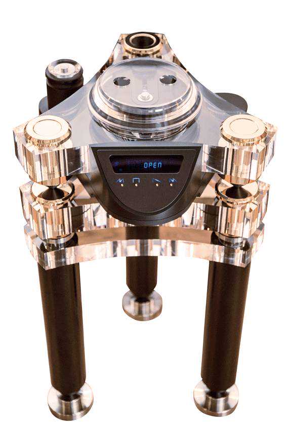 KalistaUltimateSE使用二块厚透明亚克力、Delrin(人造云石)底座与不锈钢组件构成的机身主体,设计着眼点首先是为了获得最低的谐振性能,而并非单纯为了美观,将机体谐振降到最低的措施有很多种,文豪认为不同材料的组合才是最正确的做法,而不规则的艺术化造型,也是出于切断材料内部震动传导路线的考量,无论实际应用效果或者是美观度,都如神来之笔,自然天成。从正上方往下看,机身上半部的主要部分刚好是交迭两个三角形所构成的星形,三只附尖锥的巨大不锈钢制造的脚座,以两层厚亚克力“悬吊”住中间黑色三角形的转盘系统,碟仓以Delrin材料制成,底座也是高阻尼且谐振频率很低的Delrin。底座前端斜削成操作面板与显示屏,后段平直的一边则刚好用来安排电源线与输出端子的插孔,底座的材料本身就可以吸收微小震动之外,另外三个支撑脚用直径8cm的不锈钢制造的圆柱体组成,脚钉与钉垫同样用Delrin制造,中间并夹一颗钢珠以排除横向的震动,结构上的整体考虑非常周详。