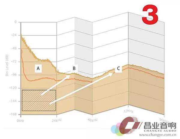 在BobStuart的官方blog中也有用这几张图来说明MQA的译码方式,其中可以看到档案结构和频率响应。请见图1,这是无译码(无展开)时的档案播放状态,只能呈现0~24kHz带宽之间的声音信息,标示为A。而无损失的声音信息B和C以编码方式隐藏在0~24kHz带宽之间的微小音量部份(甚至类似于噪音的型态),此时能播放出44.1kHz或48kHz取样率的声音效果。