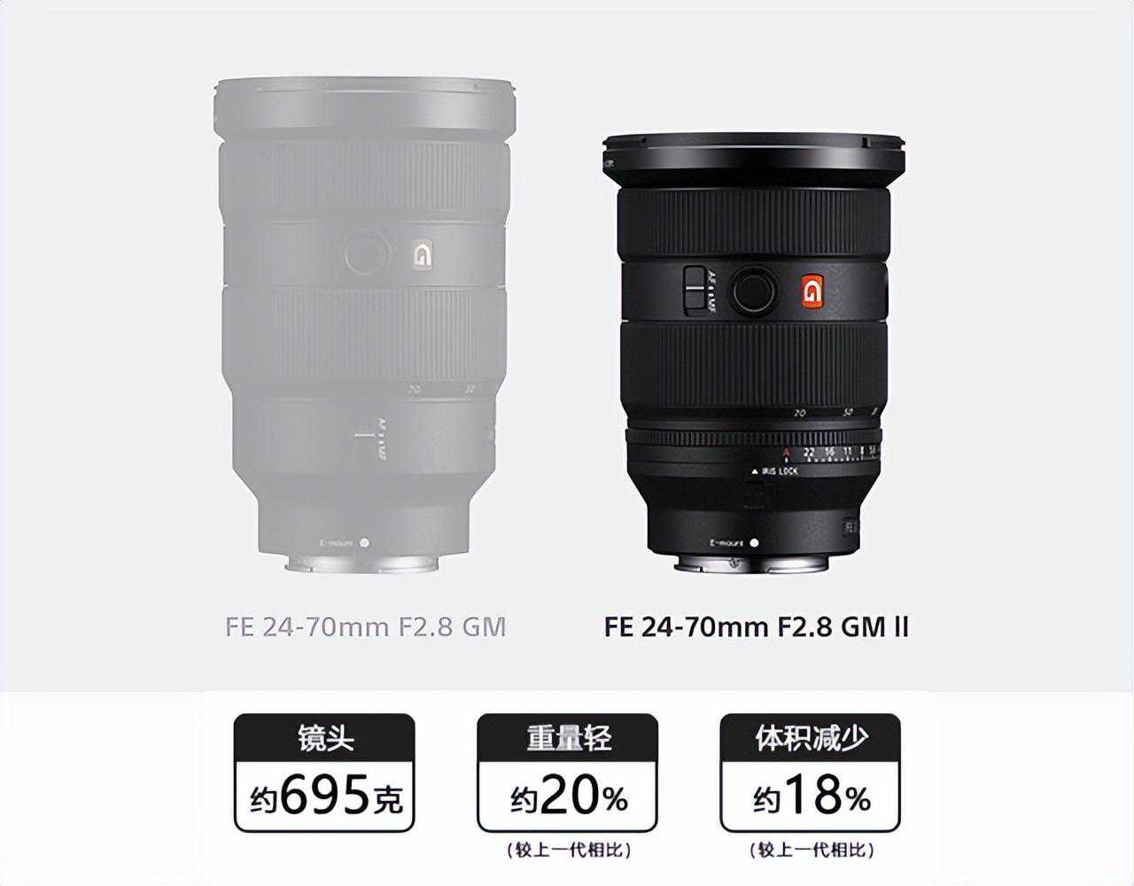 一代的FE24-70mm镜头重量为886g,算是一个中规中矩的成绩。而新发布的二代镜头,将重量缩减至695g,重量较上一代轻约20%,体积减少了约18%。做到了同级别最轻。也许您对这个成绩没有一个直观的概念,那么举个例子,FE24-105mmF4GOSS重量为663g,它们之间只差不到一个鸡蛋的重量,请听懂掌声……