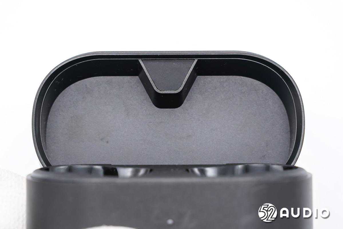 充电盒座舱内部结构一览,雕刻有L/R左右标识,便于用户快速区分。为耳机充电的金属顶针位于耳机柄座舱底部。