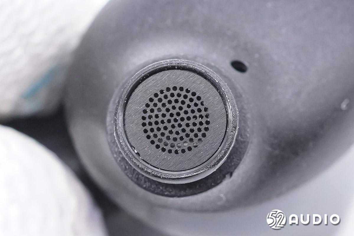 耳机出音嘴特写,圆形设计,金属盖板。