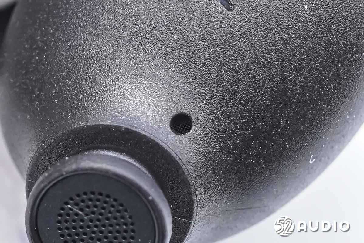 耳机内侧外观一览,前腔采用了磨砂质感,尾塞采用了倾斜的抗风噪设计,内部凹槽设置麦克风拾音孔。