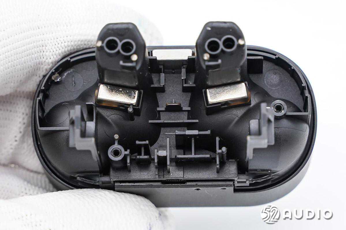 座舱底部结构一览,设置有三颗磁铁用于吸附充电盒盖和耳机。