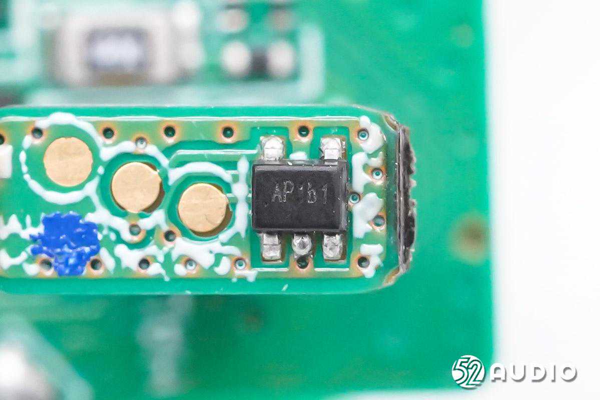 丝印APb1的霍尔元件特写,用于感知充电盒开关盖状态下的磁场变化,进而通知充电盒MCU和耳机与已连接设备配对或断开连接。