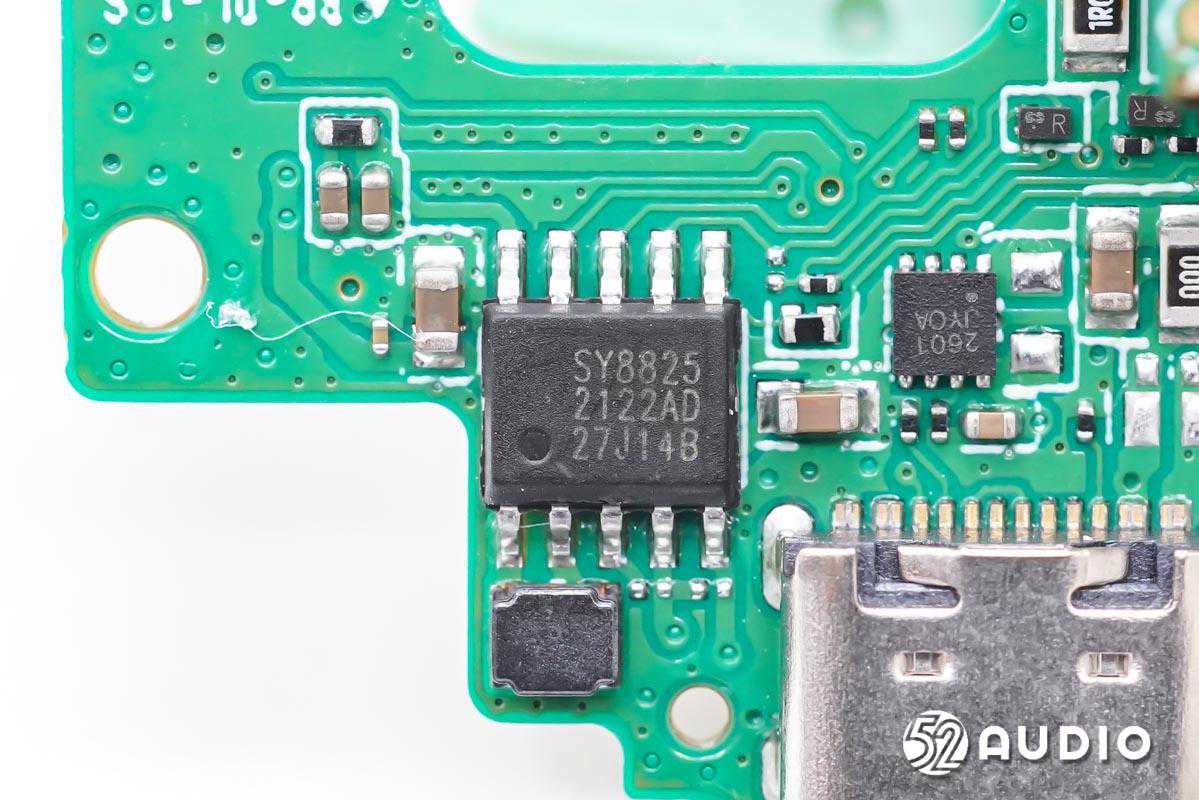 内部结构配置方面,充电盒内置电池容量500mAh,来自紫建电子,配备有电路保护板。主板上,采用了思远半导体SY8825充电仓SoC,集成充电模块和放电模块,充电电流外部可以调节,放电模块集成两路输出限流开关,支持输出电流检测;芯海CS32L010低功耗MCU,内嵌32位ARMCortex-M0内核,用于充电盒整机控制。