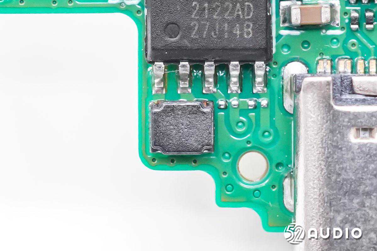 磁胶功率电感特写,配合电源管理芯片为内置电池充电。