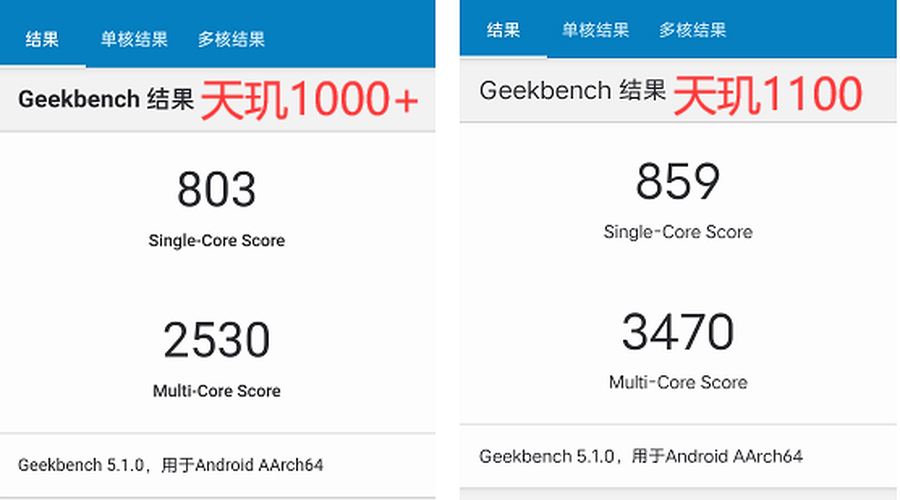 接着,使用Geekbench5对CPU进行更详细的测试。结果显示,天玑1100由于使用了新的A78大核在在单核性能上有所提升。并且在多核心性能的跑分上也同样差距明显,全新的的天玑1100在性能跑分上提升幅度在35%左右,侧面证明了换用新架构和新工艺后其带来的优势。