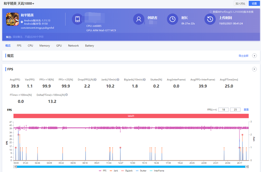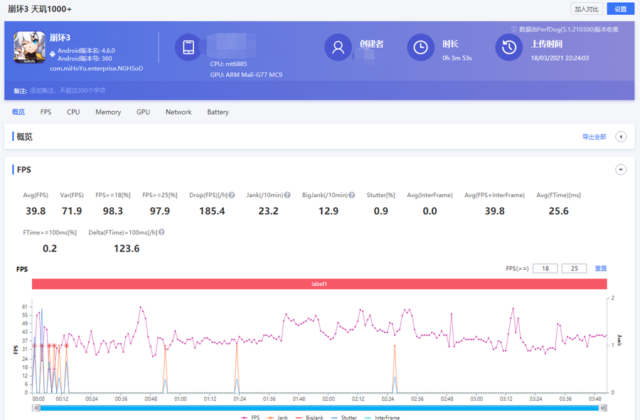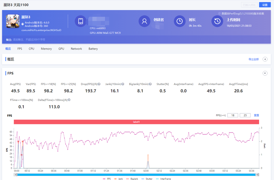 在《崩坏3》这款非常考验GPU性能的游戏上,我们将画质选项全部开至最高,在最高画质19-14关卡中进行测试。在这一个关卡中,拥有多个场景的切换,并且画面会有众多的雪花动画,可以说整个画面都充满了非常高的负载。我们可以看到天玑1100的流畅性、帧数等都会比天玑1000+优秀上不少,虽然同样采用了ArmMali-G77MC9,但是天玑1100可能会利用更先进的制程带来性能上的提升,从而在实际的性能表现上好上不少。