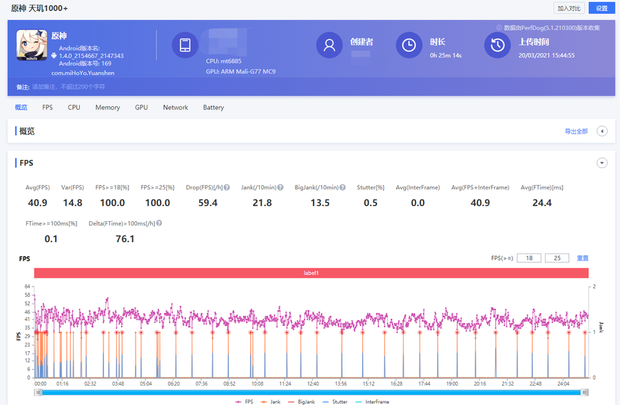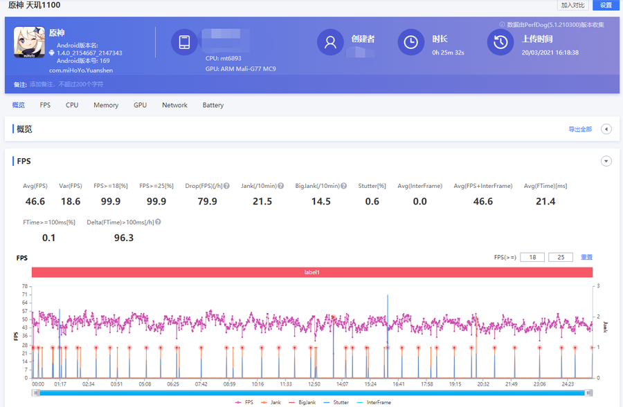 在长达25分钟的高强度负载下,我们可以看到天玑1100通过全新的大核架构和全新的工艺,使得其在《原神》这一款对CPU负载较高的游戏中跑出了比天玑1000+更好的成绩。