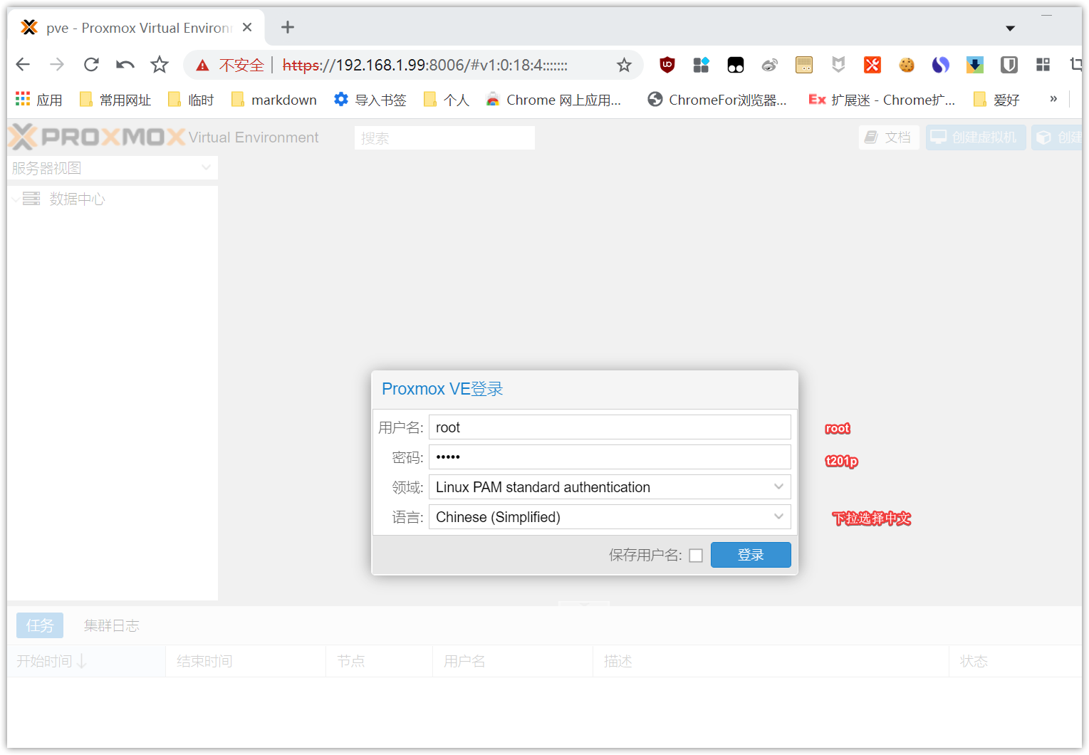 ▼然后输入下面这个网址就能登录PVE后台了,账号密码也是设定好的,输入即可。
