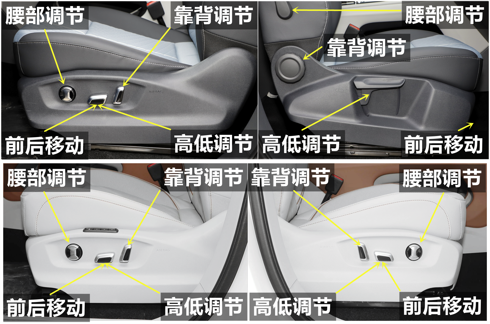 全系主驾座椅和副驾座椅都支持前后移动、高低调节、靠背角度调节和腰部调节。