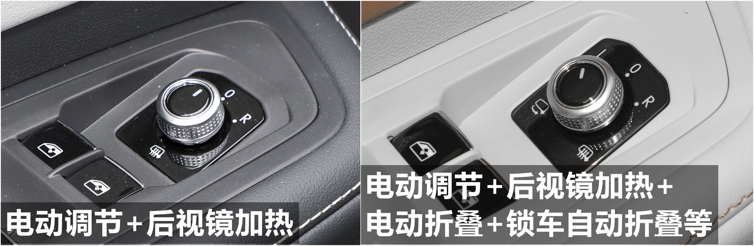外后视镜,330TSI两驱豪华版和380TSI四驱豪华版的外后视镜支持电动调节、后视镜加热功能,其他车型的外后视镜配备电动调节、后视镜加热、电动折叠、锁车自动折叠、后视镜记忆、倒车自动下翻、自动防眩目功能。