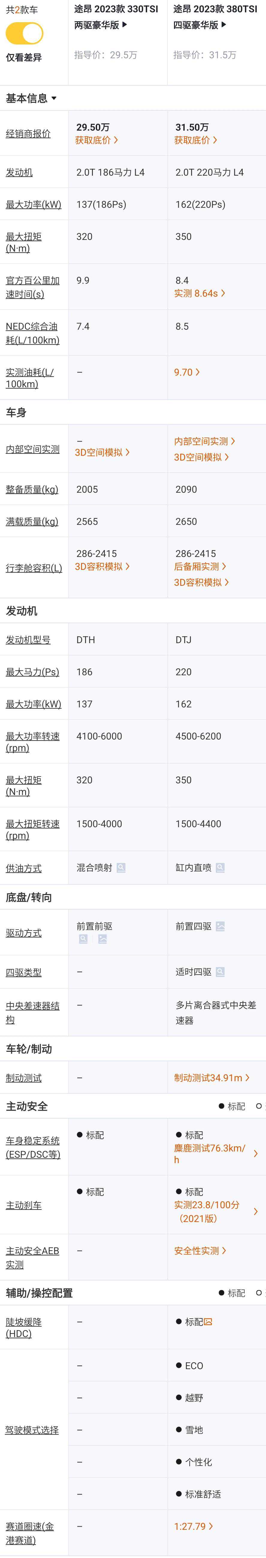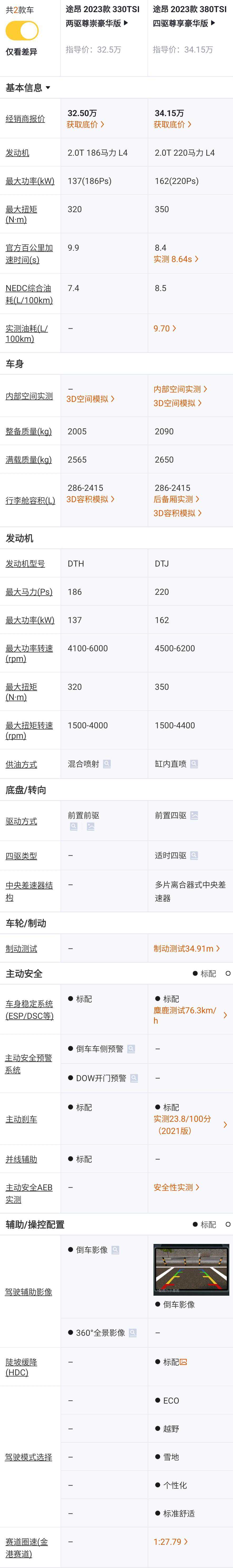 330TSI两驱尊崇豪华版对比380TSI四驱豪华版,价格+1万元,发动机喷油方式由缸内直喷调整为混合喷射,发动机都是2.0T但是功率降级,最大功率从162kW降低到137kW,发动机最大马力从220Ps降低到186Ps,适时四驱降级为前置前驱,动力变弱,少了陡坡缓降功能,少了ECO、越野、雪地等驾驶模式,但轮胎从255/55R19升级为255/50R20,多了全旅程智能驾驶辅助系统、车道保持系统、变道辅助系统(带RCTA驶出车位辅助系统),倒车影像升级为360°全景影像,多了可开启的全景天窗,方向盘多了加热功能,尾门多了感应开启功能,皮织混搭座椅升级为真皮座椅,副驾座椅从手动调节升级为电动调节,前排座椅和后排座椅多了座椅加热功能,主驾座椅多了位置记忆功能,单色氛围灯升级为30色氛围灯,外后视镜多了电动折叠、锁车自动折叠、自动防眩目、后视镜记忆和倒车自动下翻功能,多了可加热的雨刮喷嘴。增加的配置比较多,但动力降级,两者对比,还是不推荐升级。